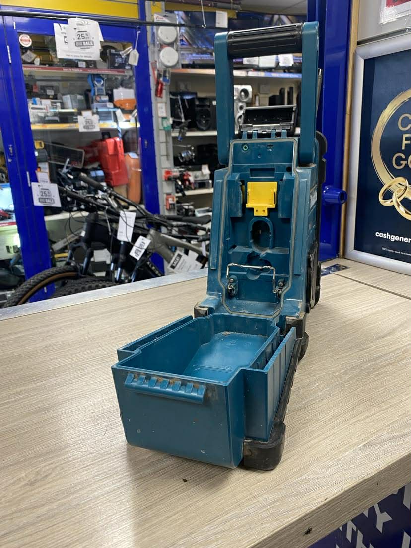 RADIO ONLY - DOESN'T COME WITH BATTERY Great working condition - cosmetic marks don't affect functionality Runs on 14,4V– 18V Li-Ion batteries or a mains adapter included in the delivery. Up to 37 hours of play time. Weather and water resistance suitable for jobsite or sports / recreational use. IP64 rated for water and dust resistance, suitable usage on job sites AUX input Compact and lightweight design Easy to read digital tuner with LCD display Carry handle for easy transportation