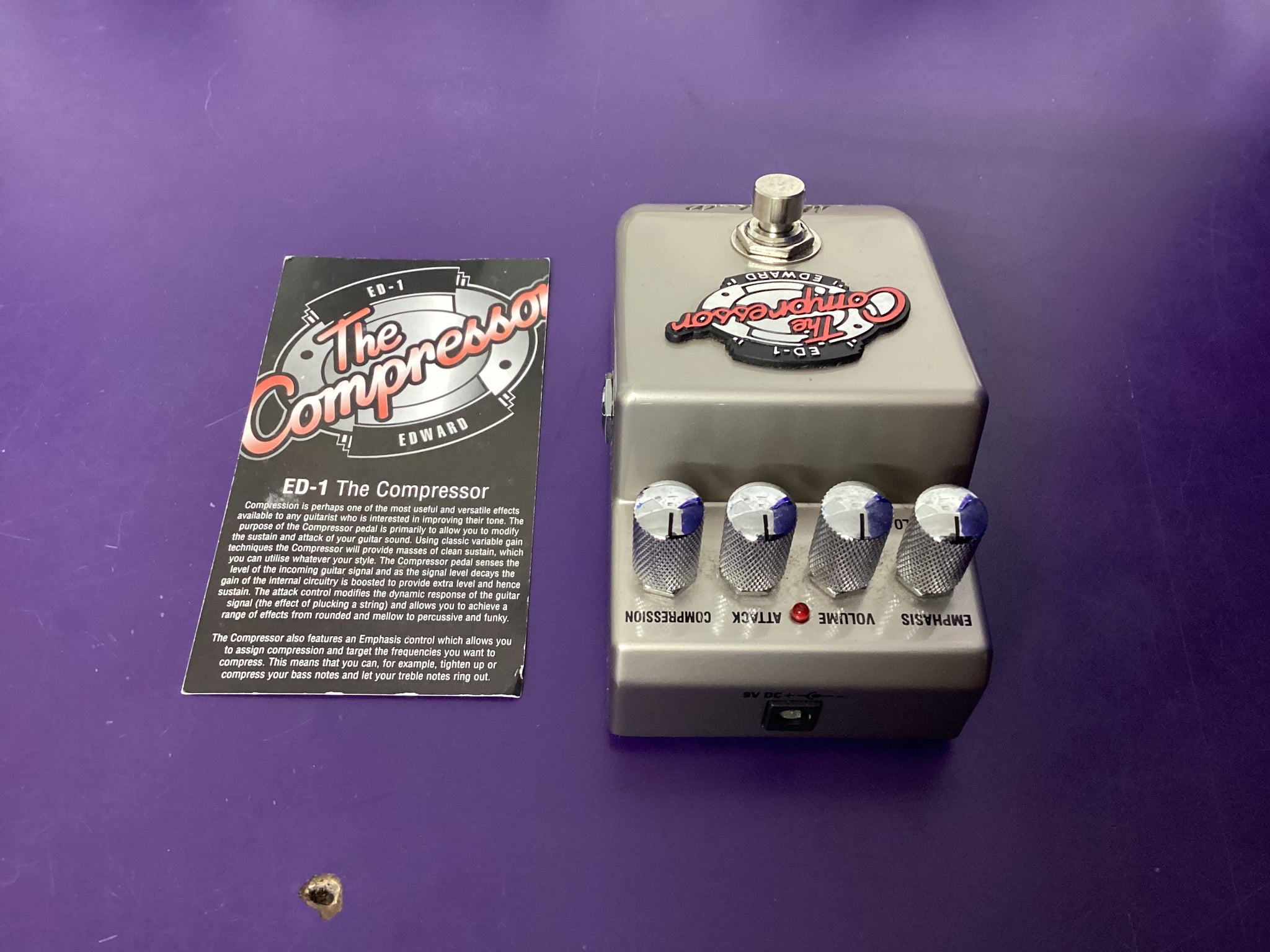 Compression/sustain guitar effect pedal that allows for modifying the sustain and attack of the guitar sound and taking control of the dynamics. Using classic variable gain techniques it will provide masses of clean sustain, which it can be utilised in any style. The pedal senses the level of the incoming guitar signal and, as the signal level decays, the gain of the internal circuitry is boosted to provide extra level and hence sustain. The Attack control modifies the dynamic response of the guitar signal (the effect of plucking a string) and allows for achieving a range of effects from rounded and mellow to percussive and funky. The pedal also features an Emphasis control which allows for assigning compression and target the frequencies the need to be compressed. It also features a Volume control, solid metal casing and passive bypass. Dimensions: 120 x 65 x 55 mm. Weight: 510 g. Free shipping