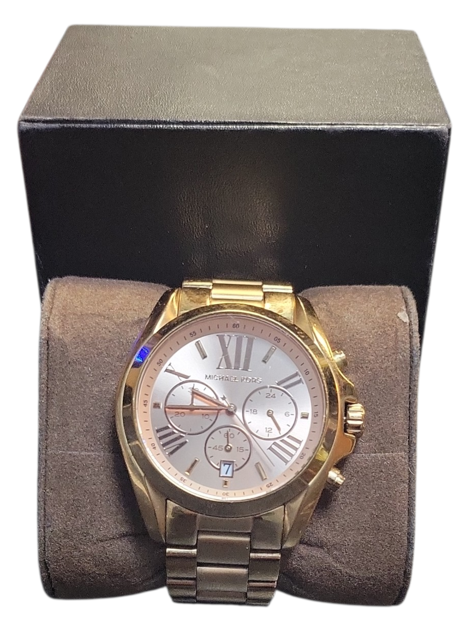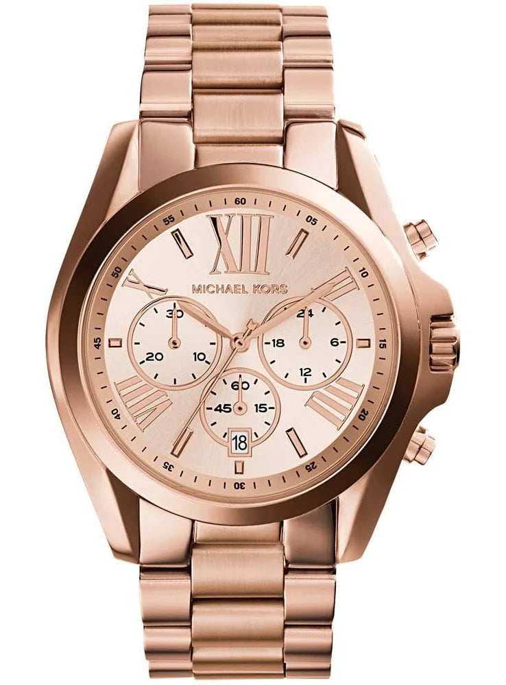 The Michael Kors, Bradshaw series features a stainless steel 43mm case, with a fixed bezel, a rose dial and a scratch resistant mineral crystal. Chronograph - sub-dials displaying: 60 second, 30 minute and 24 hour. The 20mm stainless steel band is fitted with a deployment with push button release clasp. This beautiful wristwatch, powered by quartz movement supporting: chronograph, date, hour, minute, second functions. This watch has a water resistance of up to 330 feet/100 meters, suitable for recreational surfing, swimming, snorkeling, sailing and water sports. This stylish timepiece is sure to complete any woman's collection. This watch comes with the original box.