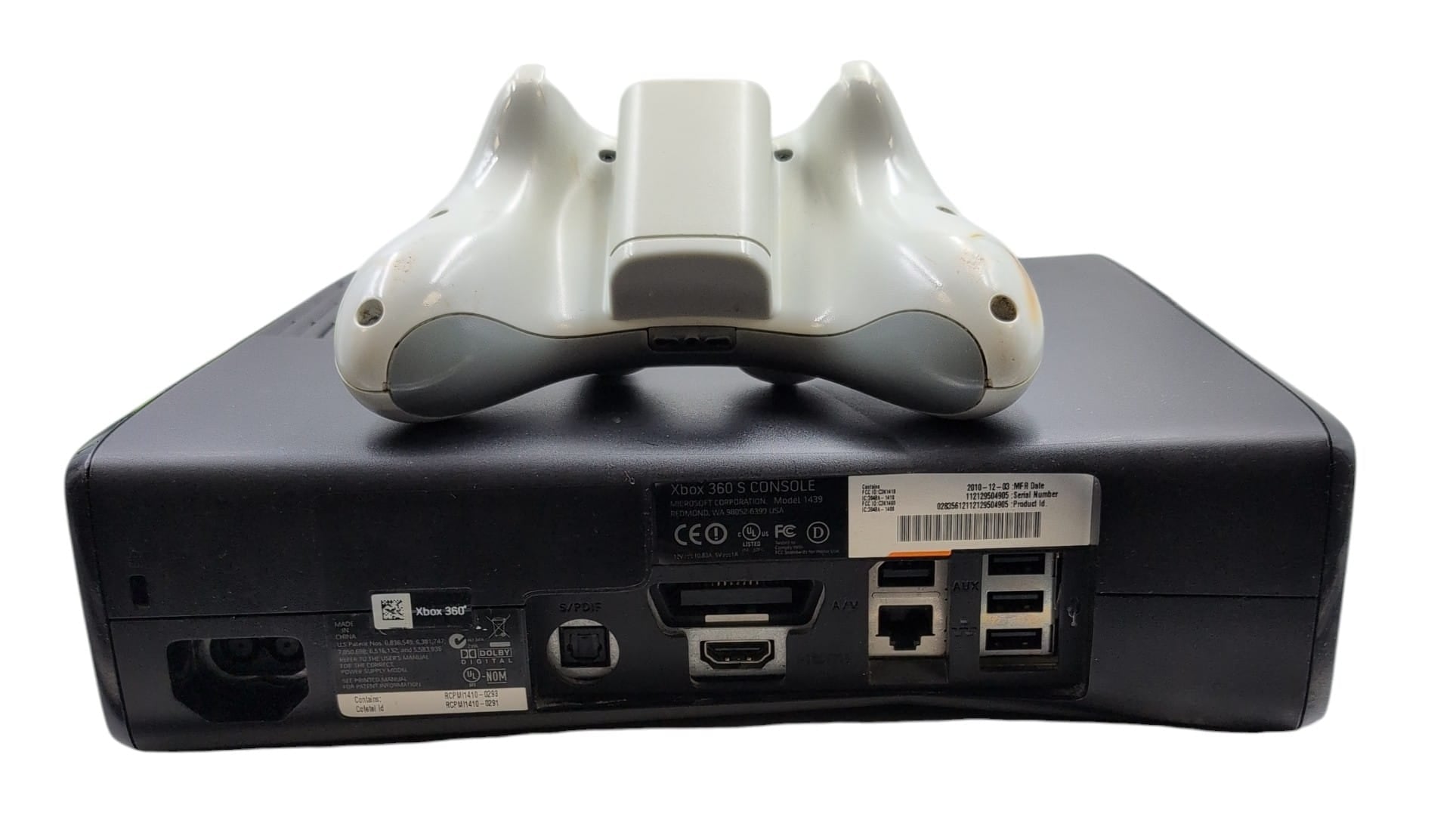 Microsoft Xbox 360 Slim 2010 Model Black with Xbox 360 Controller White. Is in good good condition. Console has light scratching is in great condition. Controller is in decent condition does have scratching and marks. Full factory rested and in great working condition.