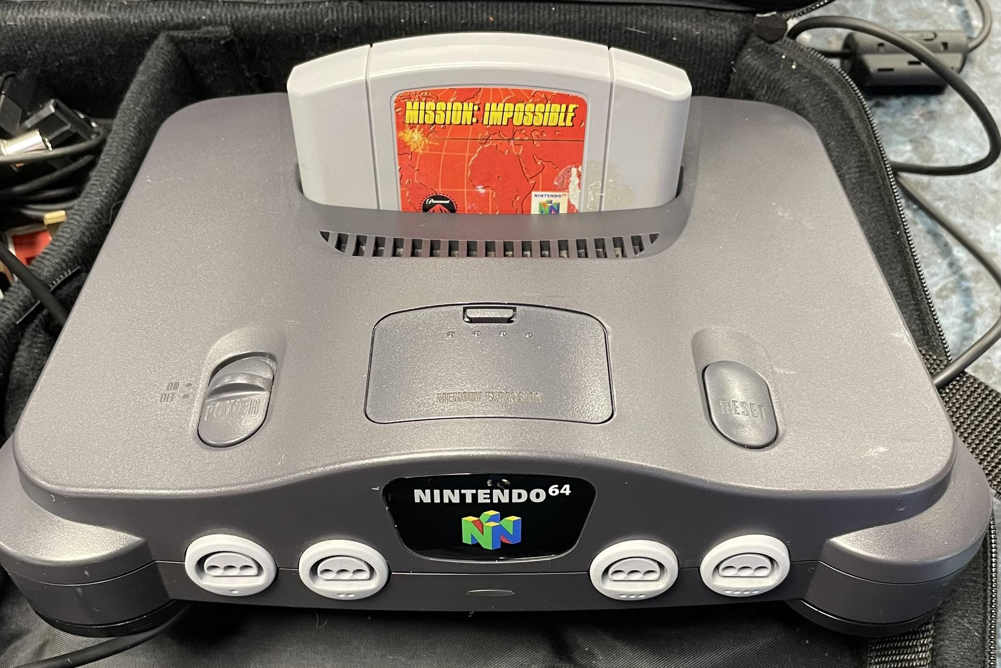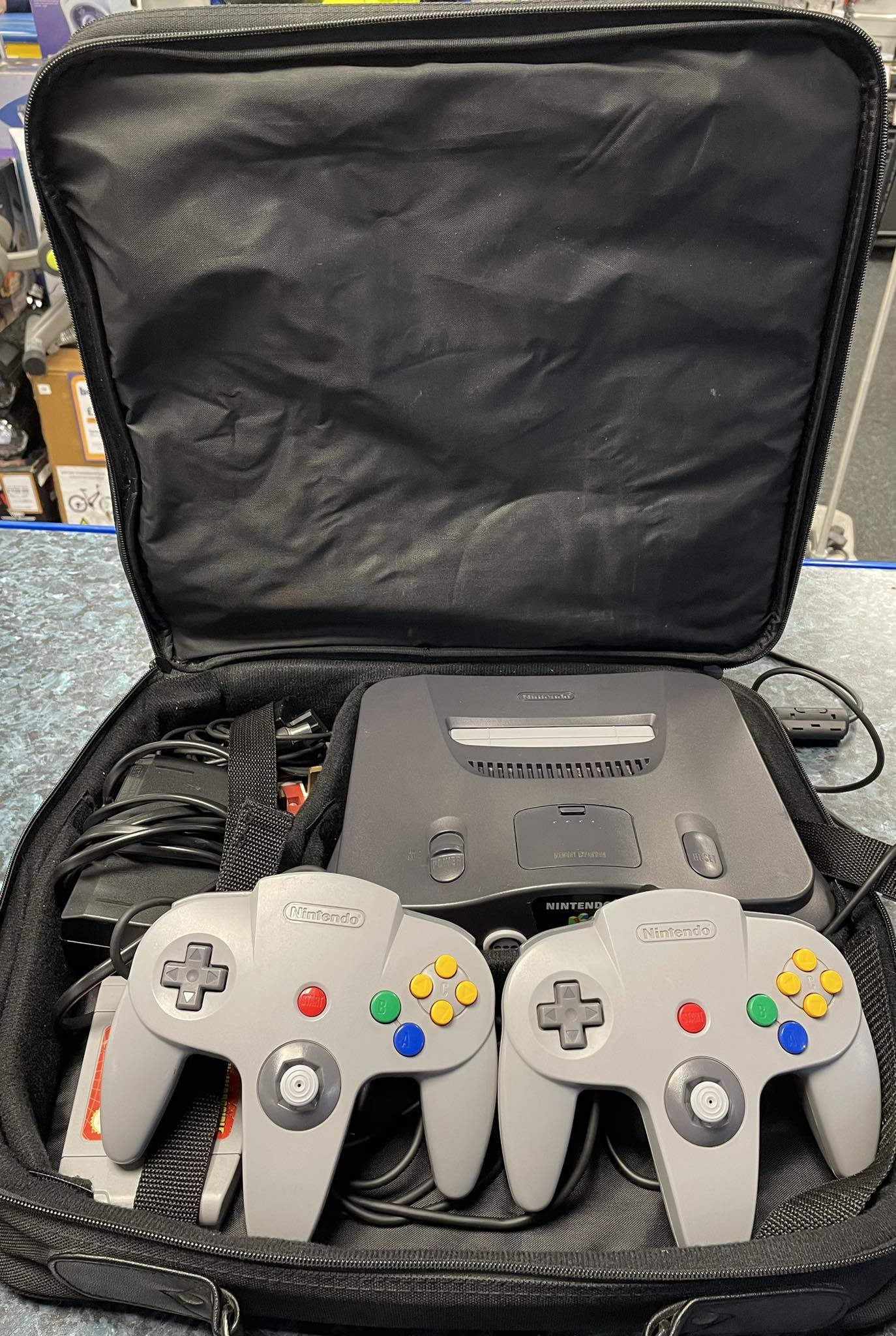 Nintendo M64 Console Comes with 2 controller, case, power lead, Mission: Impossible game. Some cosmetic wear as it is seen in photos. Good working condition