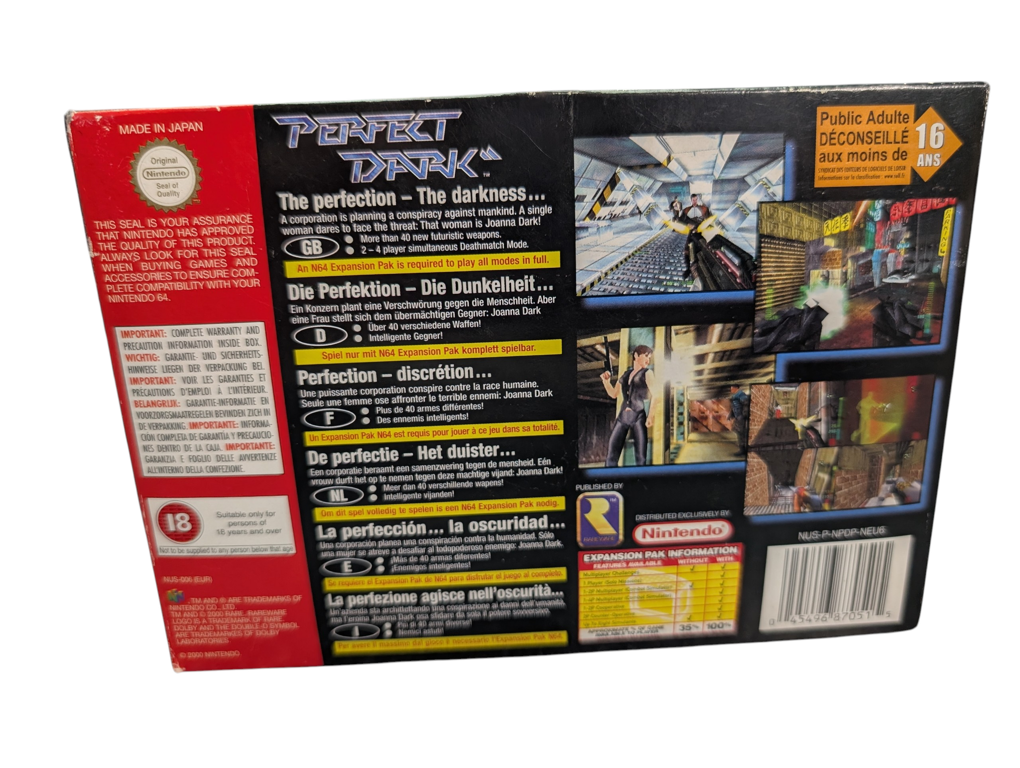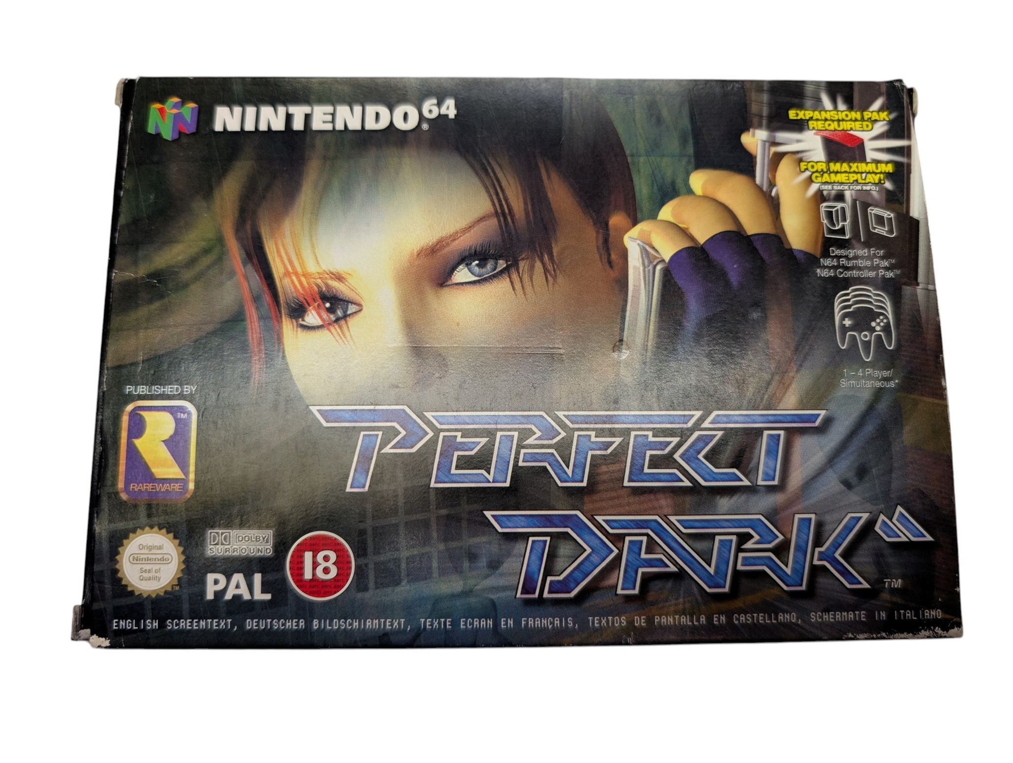 HERE WE HAVE PERFECT DARK FOR THE N64 CONSOLE BOXED WITH BOOKLETS. THERE IS SOME LIGHT COSMETIC WEAR ON THE BOX AND THIS DOES REQUIRE THE N64 EXPANSION PAK TO PLAY. ** FOR ANY QUERIES PLEASE CALL OUR PRESTON STORE DIRECT MON-SAT 01772 204889