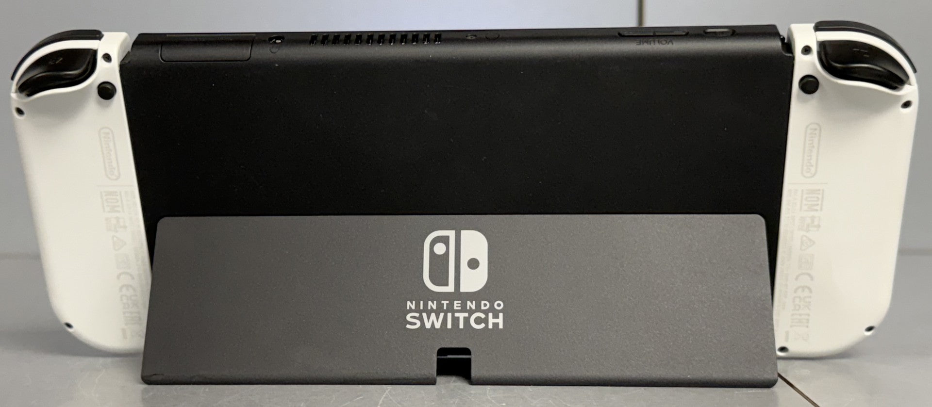 7-inch display Nintendo Switch OLED Model includes a vibrant 7-inch OLED screen with a slimmer bezel. The large screen's vivid colours and high contrast deliver a rich handheld and tabletop gaming experience, bringing games to life whether you're racing at top speed or squaring off against enemies. What is an OLED screen? An OLED screen does not have a backlight like LCD screens, instead displaying images using light emitted by each individual pixel. Deep blacks can be represented by turning a pixel's light off, allowing for higher contrast. Enjoy tabletop mode at your preferred viewing angle Flip out the stand and hand a controller to another player to share the screen and enjoy competitive or co-operative multiplayer, anytime and anywhere. Nintendo Switch OLED Model's wide adjustable stand can be set to your preferred viewing angle for comfortable gameplay in tabletop mode. Onboard speakers with enhanced audio Enjoy clear sound when playing in handheld or tabletop modes. Three play modes Nintendo Switch can transform to suit your situation, so you can play the games you want, no matter how busy life may be. Enjoy games anytime, anywhere, with anyone! TV mode Gather around a big screen and enjoy gaming with a crowd. Dock your Nintendo Switch to enjoy HD gaming on your TV. Tabletop mode Share the screen, share the fun. Flip the stand to share the screen, then share the fun with a multiplayer game. Handheld mode Carry around a large, beautiful display anywhere you go. Pick it up and play with the Joy-Con controllers attached. Enjoy playing solo, or play together with friends locally or online. Share the fun with Joy-Con Nintendo Switch has a controller on each side of the console that function - the Joy-Con. Hold them vertically, horizontally, or share one with a friend to enjoy competitive or co-operative gameplay anytime, anywhere. Local wireless Players can sync together up to eight Nintendo Switch, Nintendo Switch - OLED Model or Nintendo Switch Lite consoles to play competitive and co-operative multiplayer games.