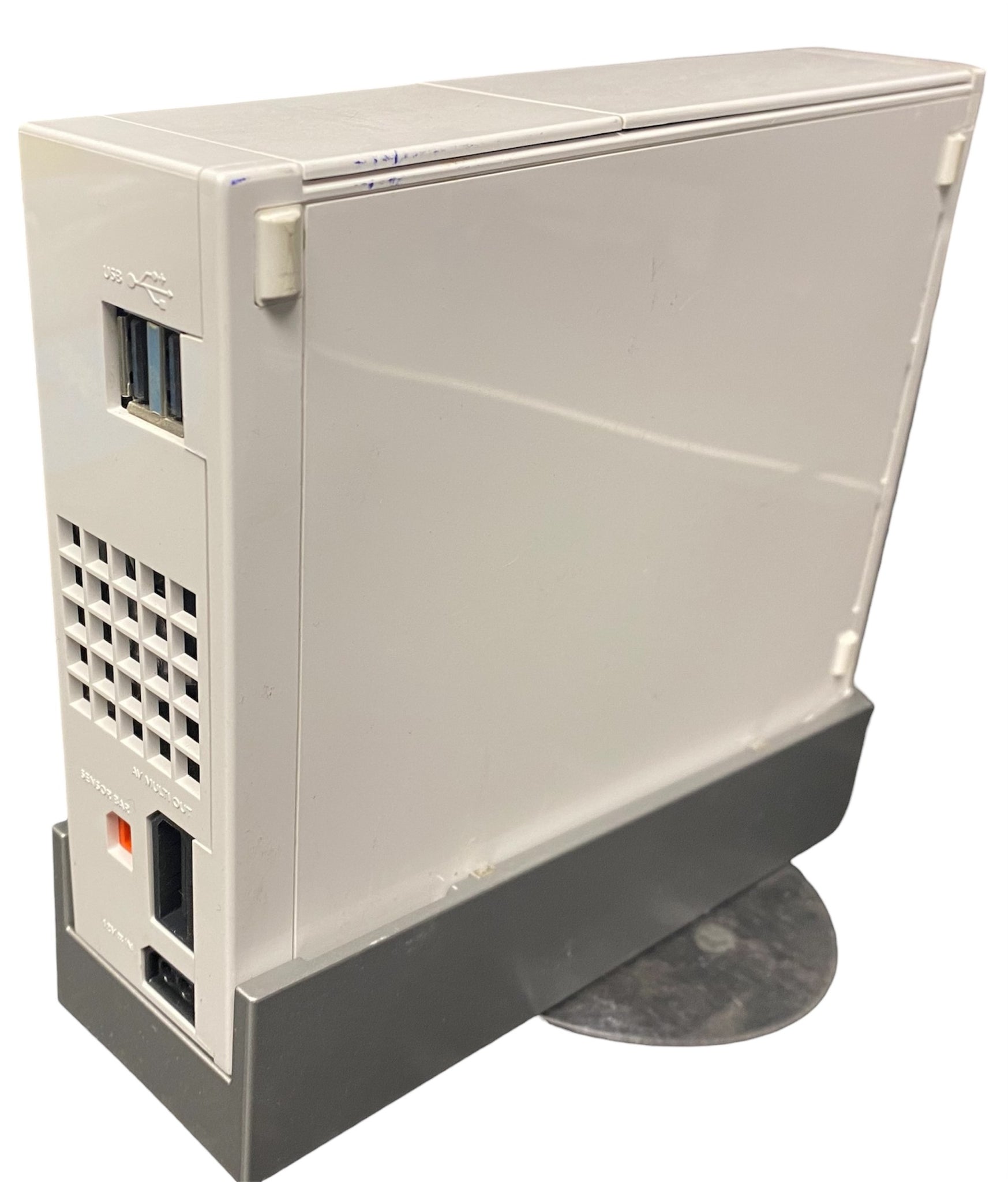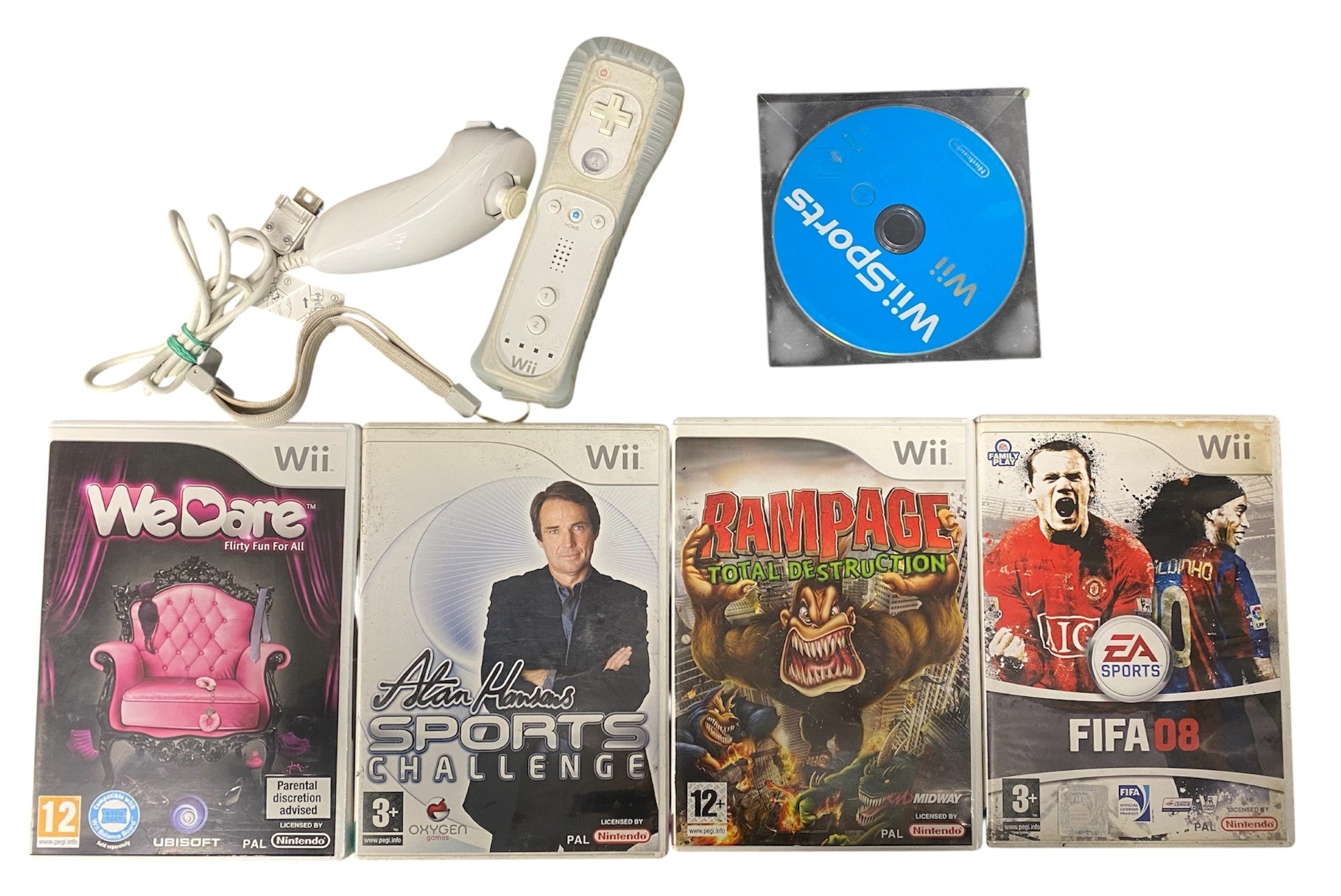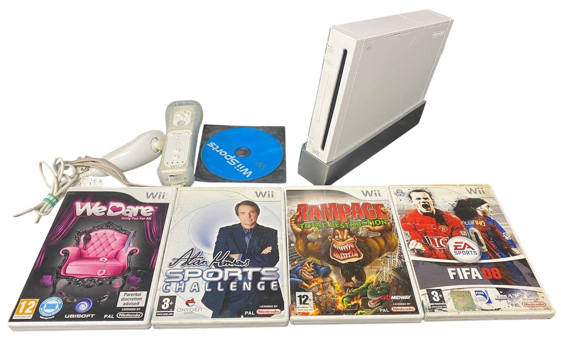 Good working order. Comes unboxed with leads, stand, wii-mote with nun-chuck & 5 games. Some scuffs to side of console.