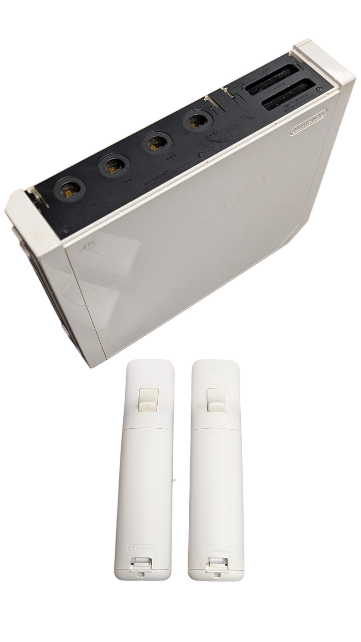 Scratches and cosmetic marks, the panel for gamecube controllers is missing but in working order. Comes with games, 2 controllers and nunchuck.