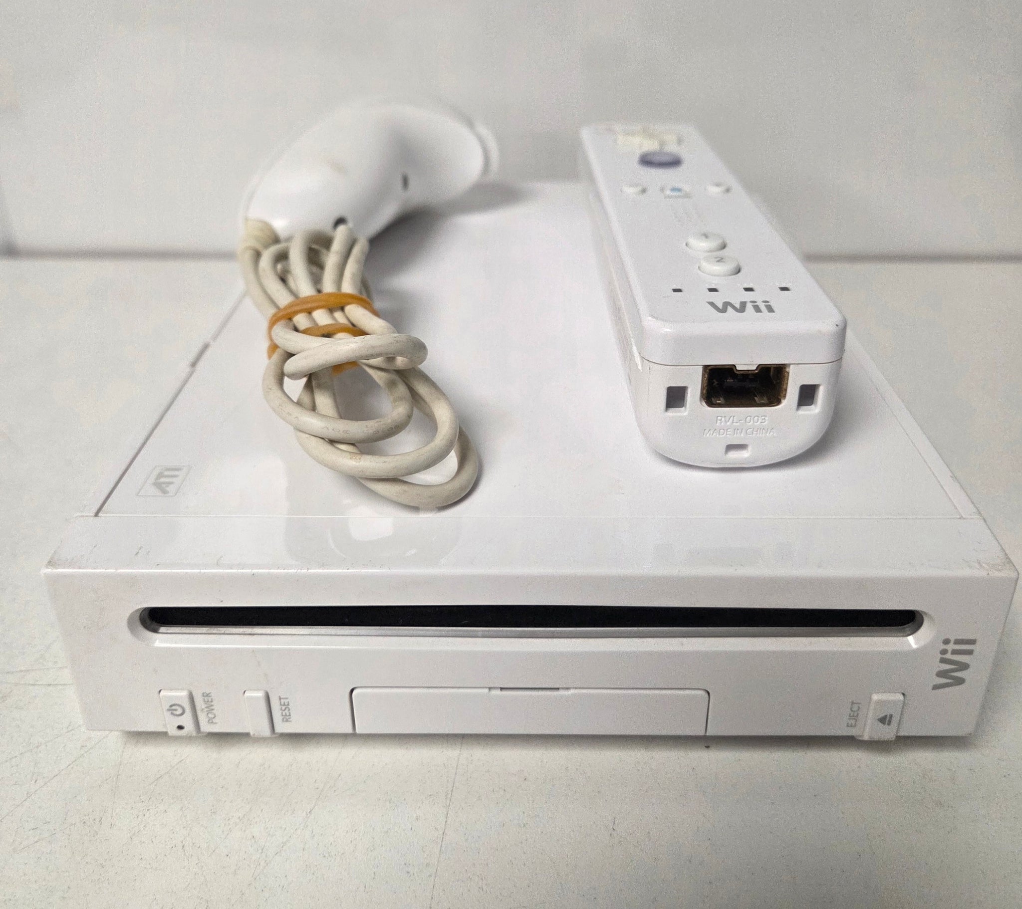 Unboxed. Includes power lead, TV lead, Sensor bar, remote & Nunchuck