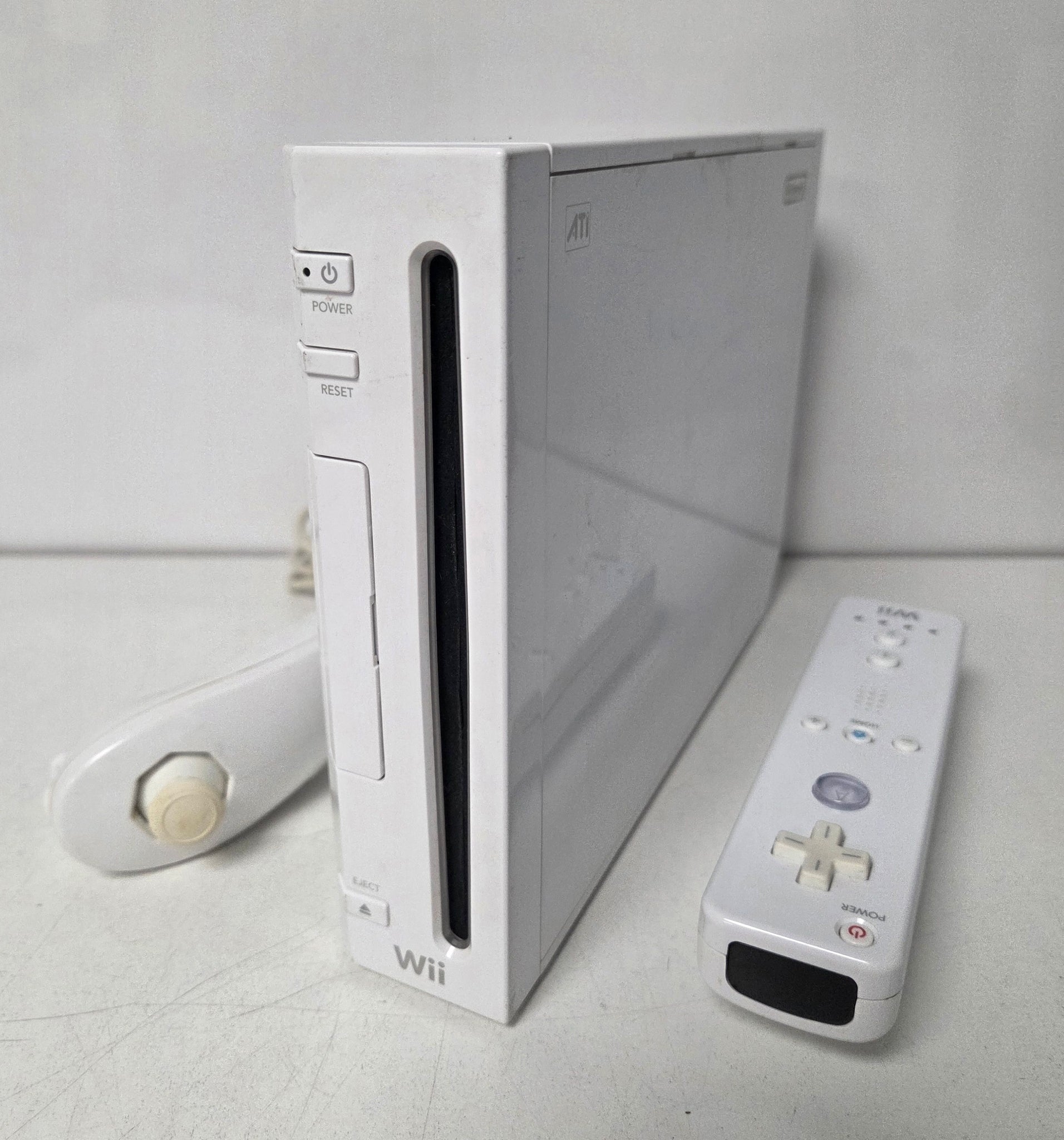 Design Featuring a compact design that makes it a natural addition to any television setup, the Wii console is white in color and can be displayed either vertically or horizontally. Compatibility The Wii is backward-compatible to all Nintendo GameCube games and includes four ports for controllers and two slots for memory cards. Media A single self-loading media bay plays single- or double-layered 12-cm optical discs for the Wii console, as well as 8-cm Nintendo GameCube discs. Size About 8.5 inches long, 6 inches wide and less than 2 inches thick (roughly the size of 3 DVD cases stacked on top of each other). Input / Output Input: Four Wii Remotes can communicate with Wii, which features a bay for an SD memory card. Output: An AV Multi-output port for component, composite or S-video. CPU / GPU PowerPC CPU (code-named "Broadway"), made with a 90nm SOI CMOS process, jointly developed with and manufactured by IBM; GPU developed with ATI.