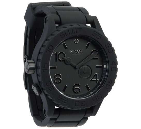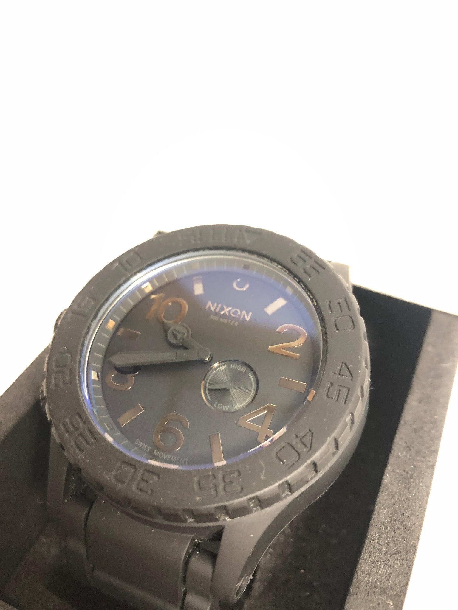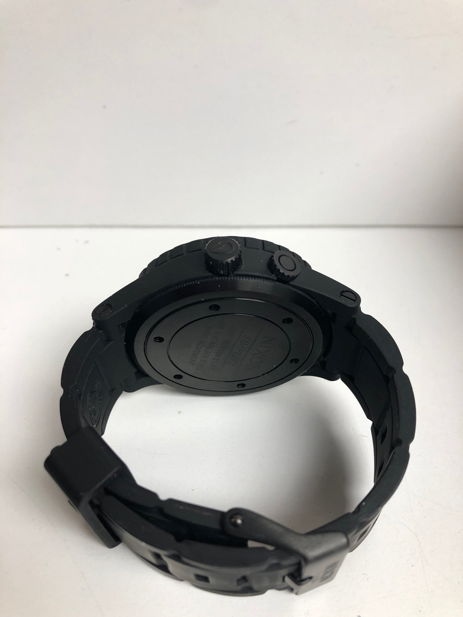 Nixon The Rubber 51-30 watch in Black. Men's analogue Nixon The Rubber 51-30 watch with an over-sized Black circular face, Black Nixon logo at 12 o'clock, tide time sub dial at 4 o'clock, Black hour and minute hands, Black screw in crown & function button at 8 & 9 o'clock, Black rubber external case with stainless steel interior, Black custom injected silicone rotating bezel, Black silicone strap with a Black stainless steel buckle. Swiss movement, battery operated, 300 meter waterproof.