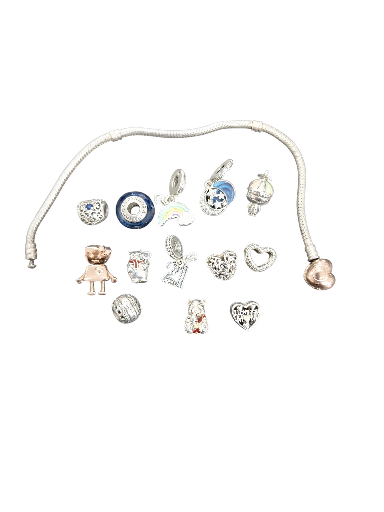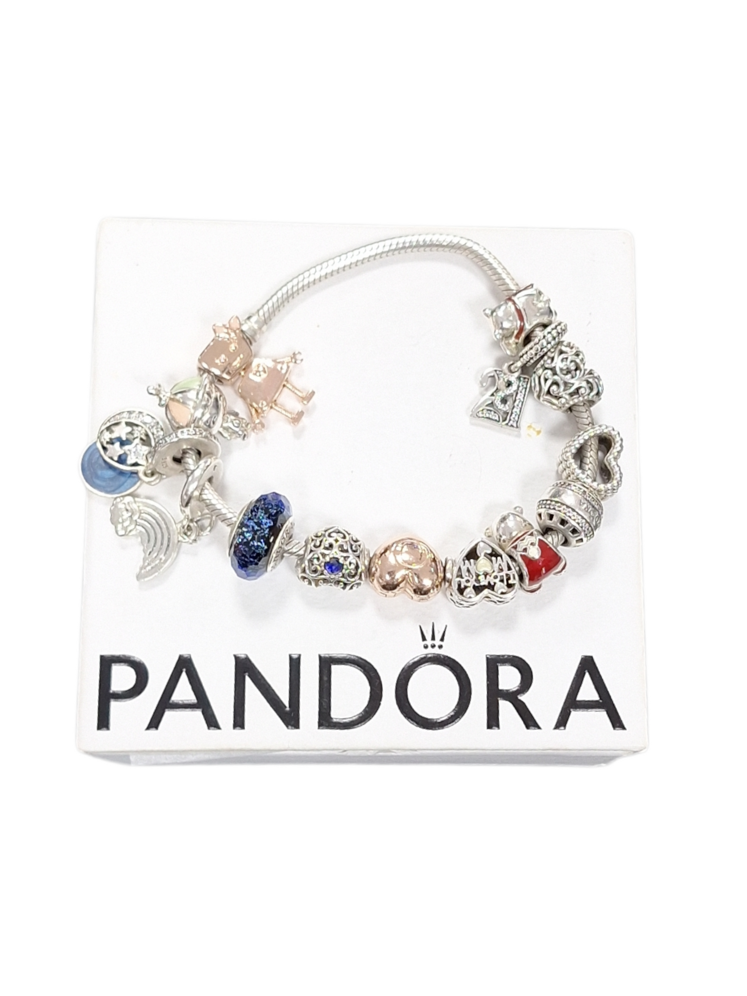 OFFICIAL PANDORA ROSE GOLD HEART CLASP SNAKE CHAIN SILVER BRACELET WITH 13 CHARMS, BOXED
