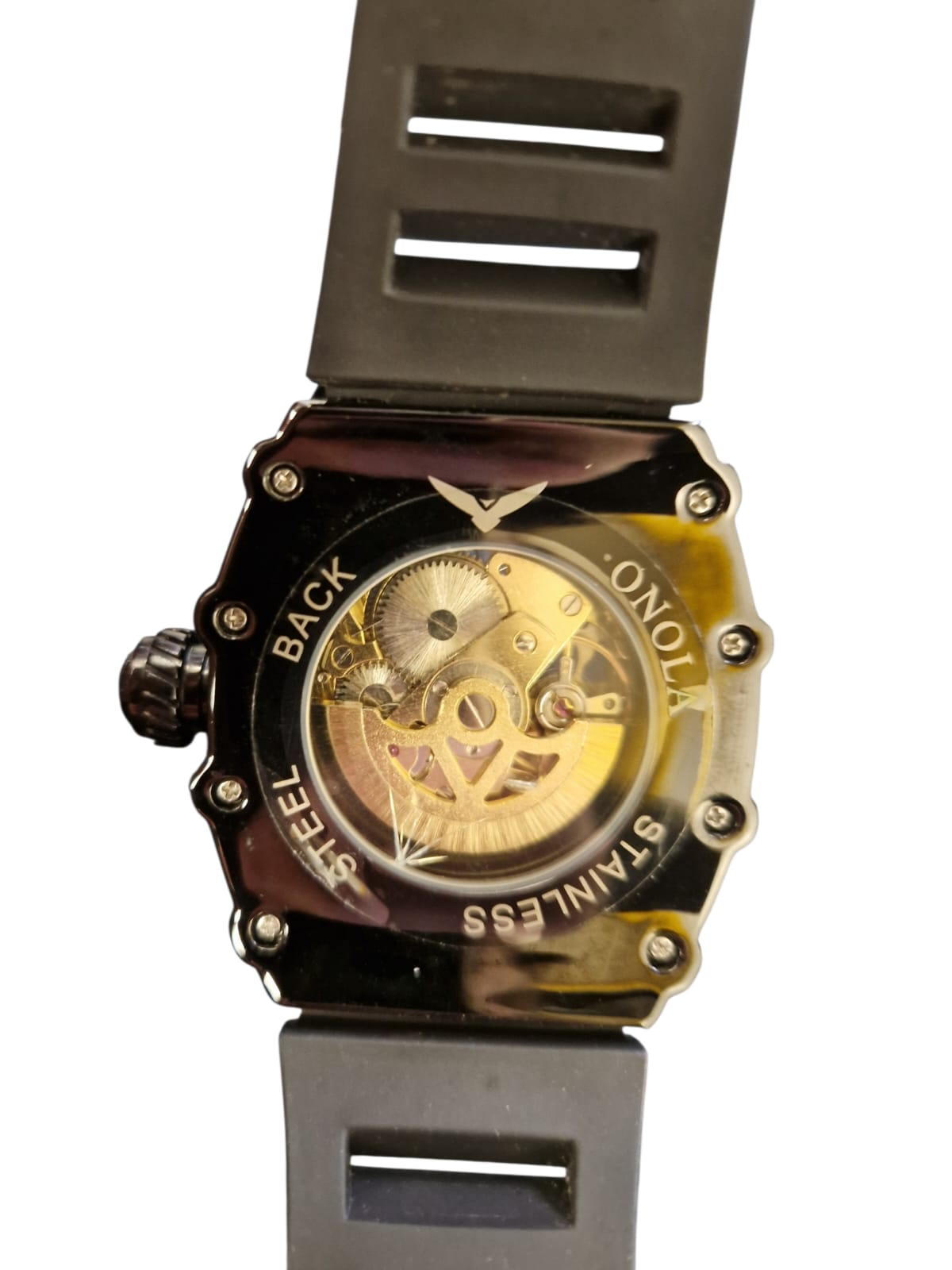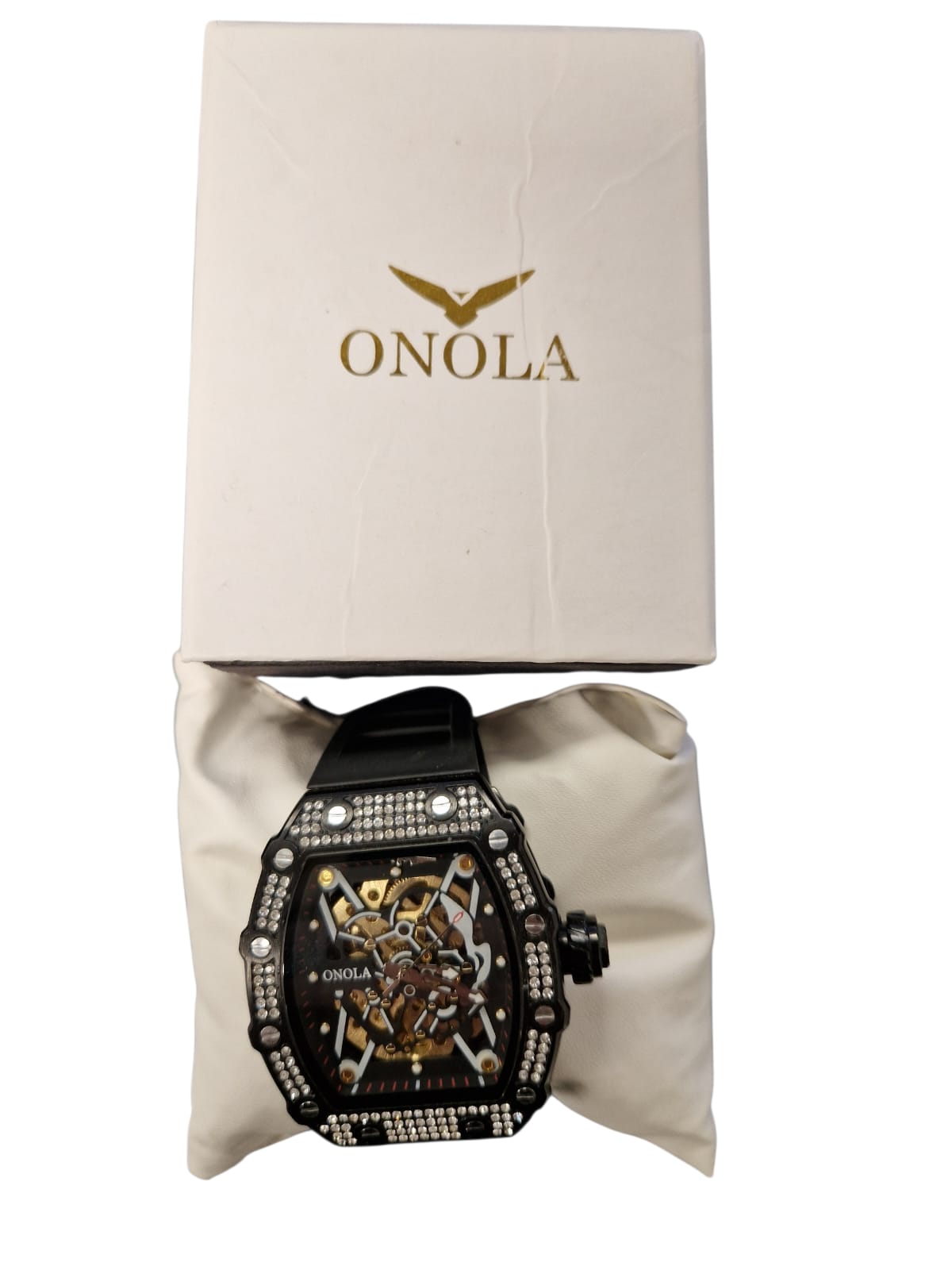 Black watch with rhinestones along the face, inner mechanisms visible, thick block like design.