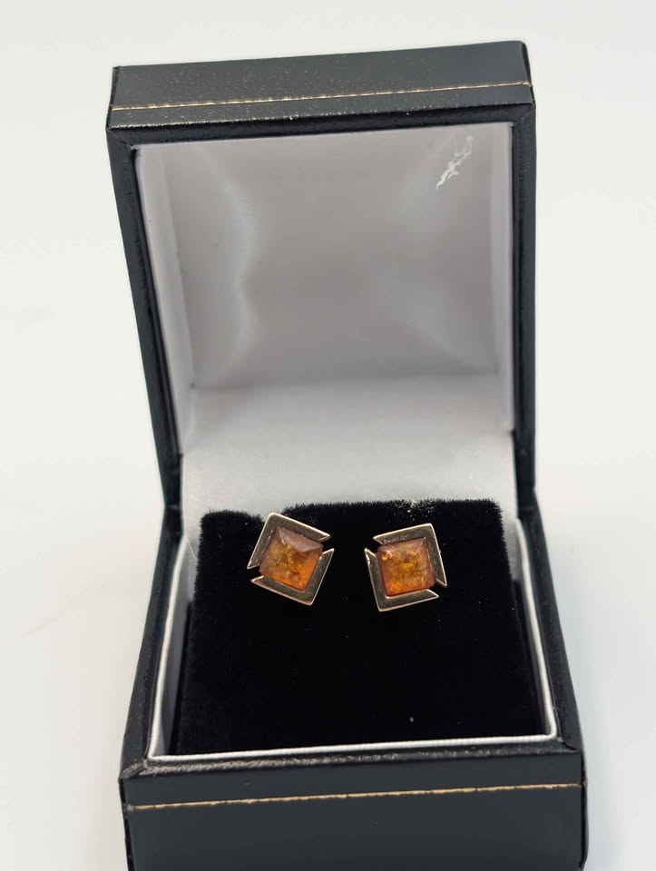 Pair Of Square 9ct Yellow Gold Honey Amber Earrings - 2.04 Grams