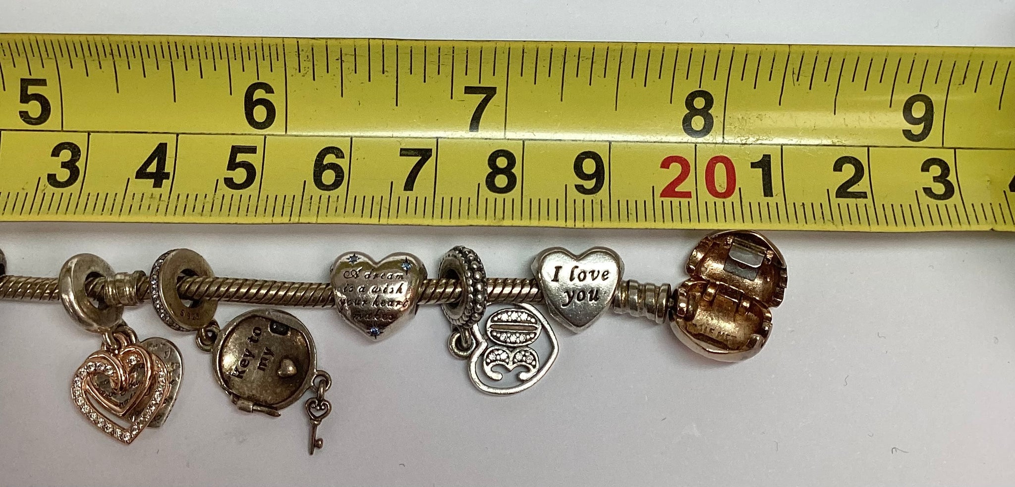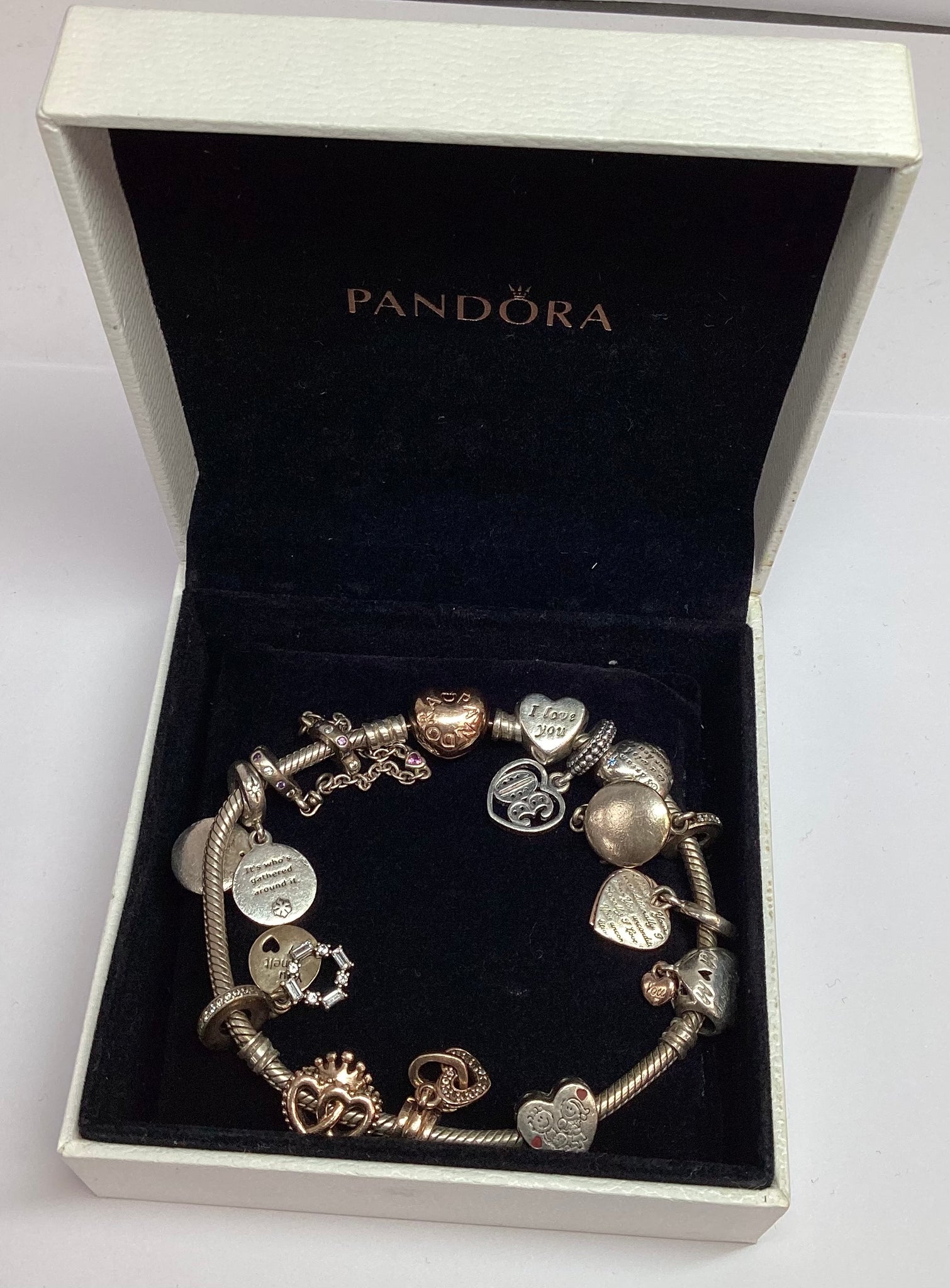 This Pandora charm bracelet is 21cm" and comes with the charms as pictured. In good condition.