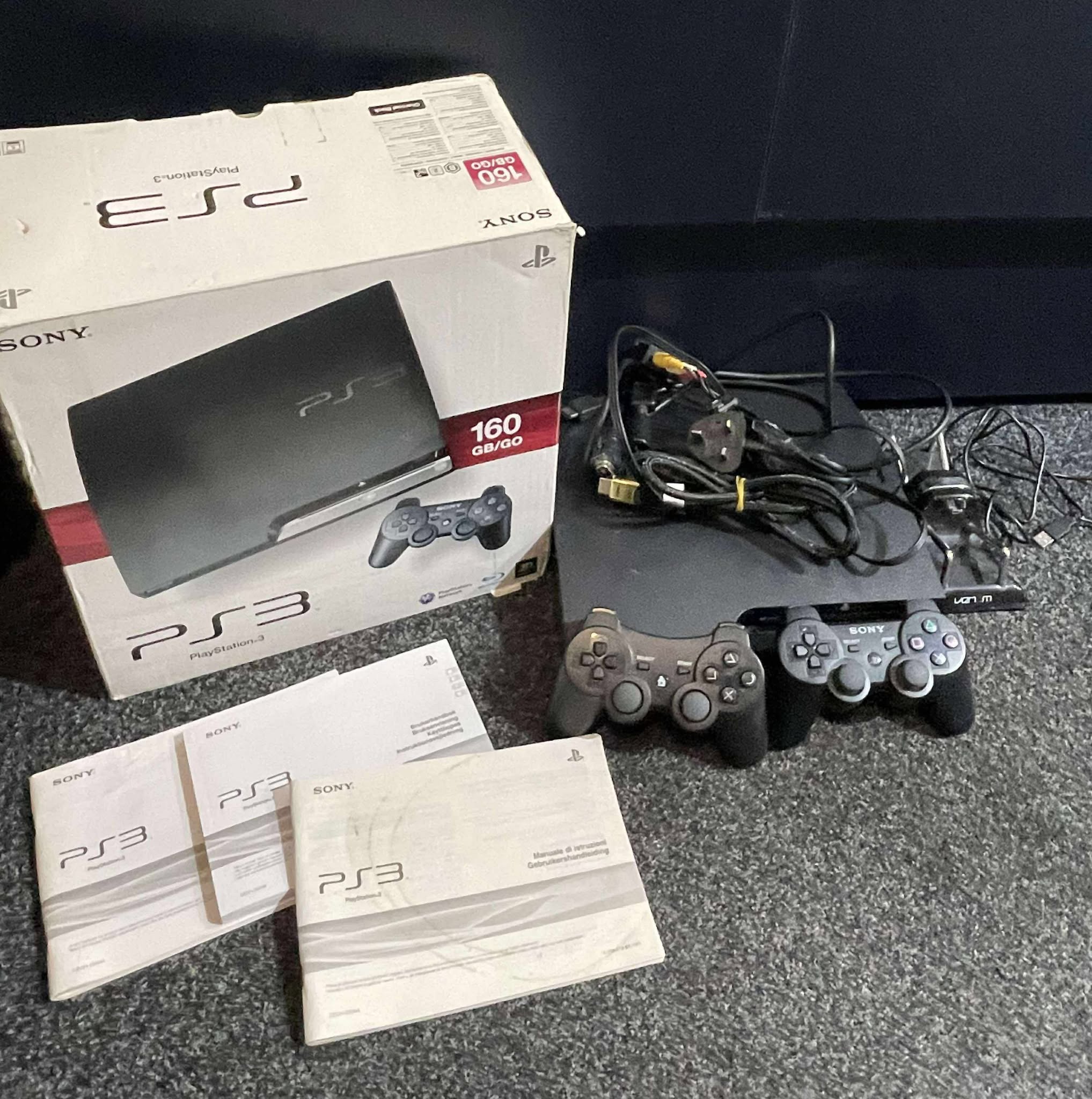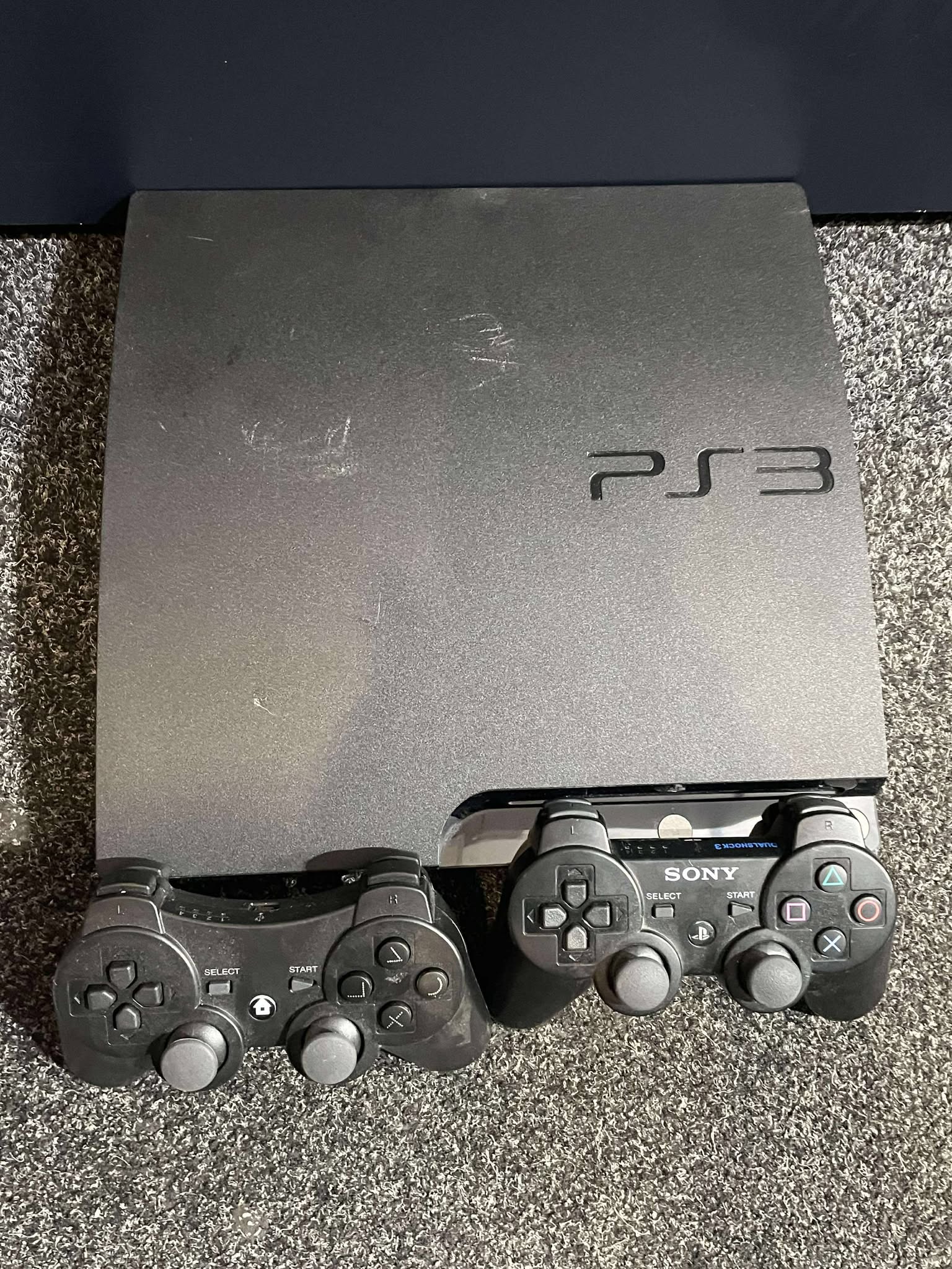 PS3 slim - 120gb Comes with official pad and third party pad Comes with all wires needed for the console Comes with Venom charge dock and lead Comes boxed Some cosmetic marking on the front of console as shown in photo Tested in store all working fine