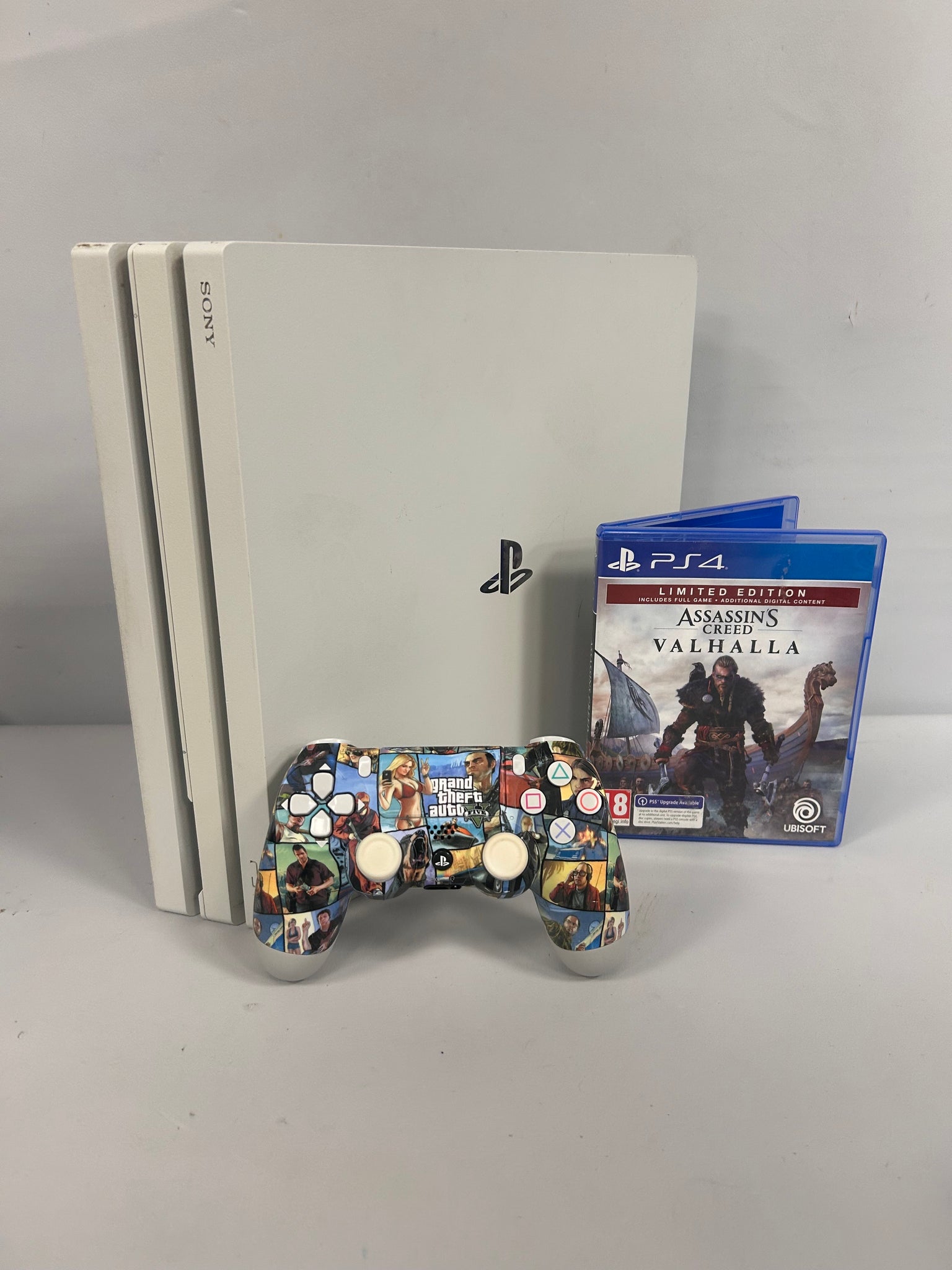 PlayStation 4 Pro 1TB White Vallhalla Package In good condition with leads, controller and game shown *missing cover on back still fully working*