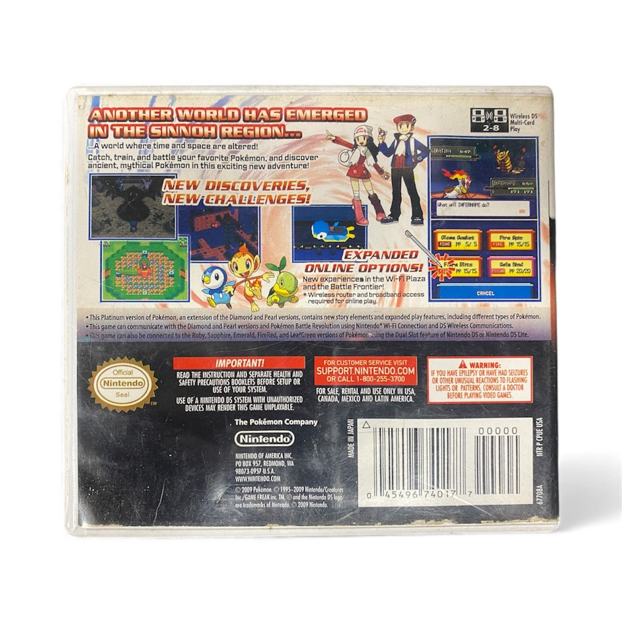 Following the vast popularity of Pokémon Diamond and Pokémon Pearl, Pokémon Platinum is the newest in the core series of Pokémon games. Pokémon Platinum features a new story full of adventure, never-before-seen forms of powerful Pokémon – including the legendary Giratina's Origin Forme – and the Distortion World, a mysterious new world that suddenly appears in the Sinnoh region. In addition, with Pokémon Platinum up to 20 players can interact with other Pokémon fans from around the world in the new Wi-Fi Plaza, featuring mini-games and activities. Players can also enjoy the new features in the Global Terminal, such as posting battle videos using the new "Vs. Recorder." In addition, Pokémon Platinum features a new Battle Frontier, where the toughest Trainers can test their skills in new ways. Pokémon Platinum already has broken previous Nintendo DS sales records in Japan, selling more than 1 million copies in its first two days of release.