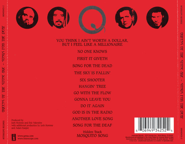 You Think I Ain't Worth A Dollar, But I Feel Like A Millionaire 3:12 No One Knows 4:38 First It Giveth 3:18 Song For The Dead 5:52 The Sky Is Fallin' 6:15 Six Shooter 1:19 Hangin' Tree 3:06 Go With The Flow 3:07 Gonna Leave You 2:50 Do It Again 4:04 God Is In The Radio 6:04 Another Love Song 3:16 Song For The Deaf 6:42 Hidden Track Mosquito Song 5:38