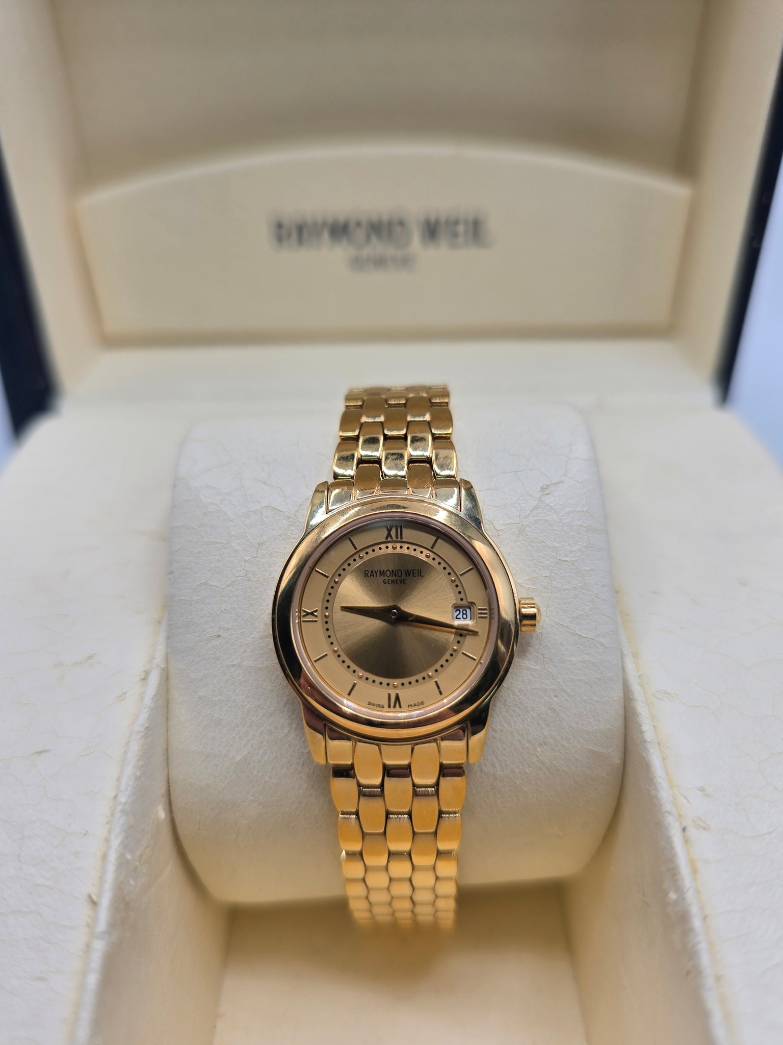 RAYMOND WEIL 18CT GOLD PLATED TRADITION WATCH BOXED, BOX HAS SOME MARKS BUT WATCH IN GOOD CONDITION