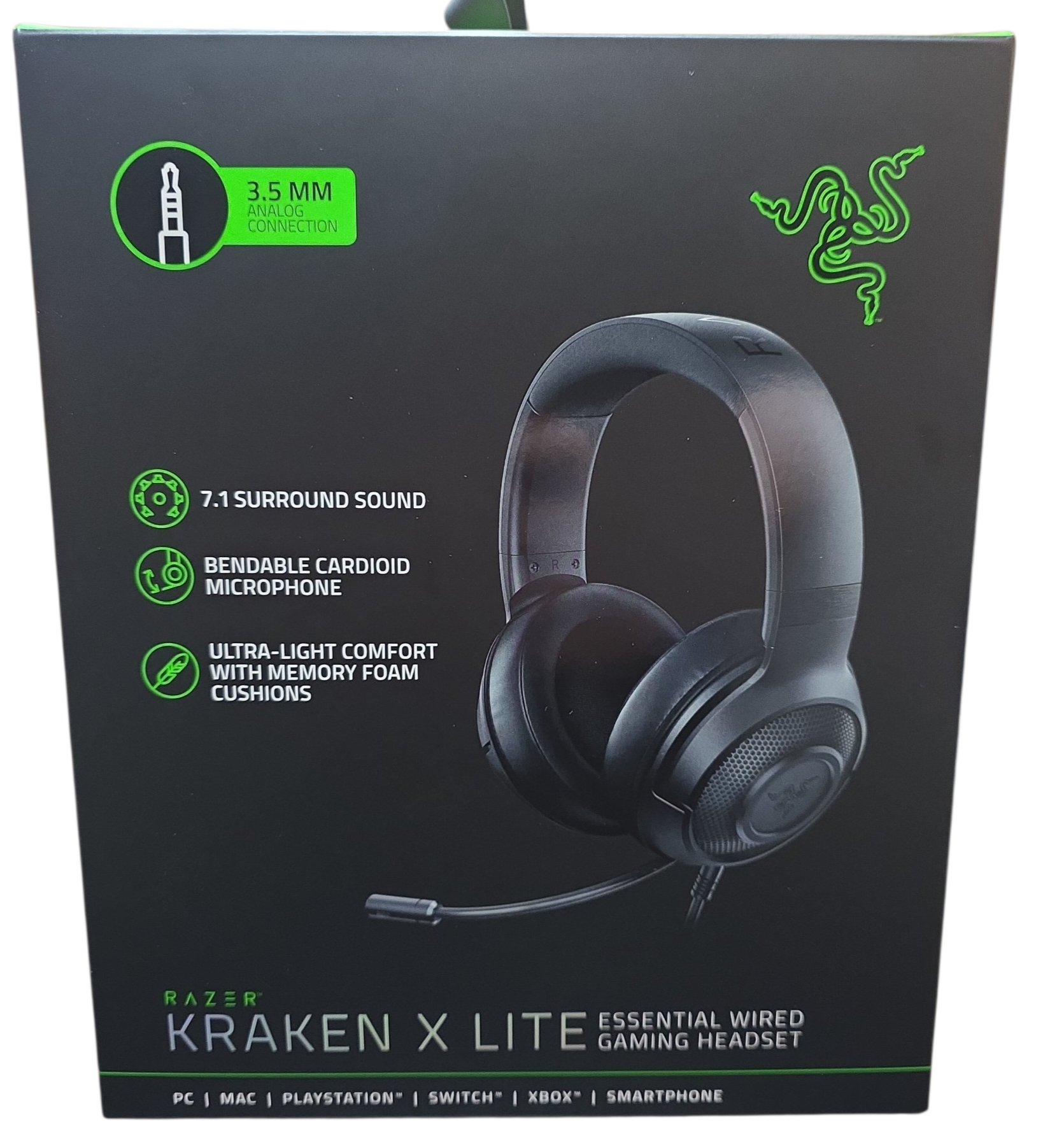 The Razer Kraken X Lite is a gaming headset designed to deliver immersive 7.1 surround sound for an enhanced gaming experience. The headset is lightweight and comfortable, featuring soft ear cushions and an adjustable headband. It has a flexible cardioid microphone that provides crystal-clear communication with teammates, and can be easily muted by flipping it up. The headset is compatible with a wide range of devices, including PC, Mac, Xbox One, PlayStation 4, Nintendo Switch, and mobile devices with a 3.5mm audio jack. With its high-quality audio and comfortable design, the Razer Kraken X Lite is an excellent choice for gamers looking for a reliable headset that won't break the bank.