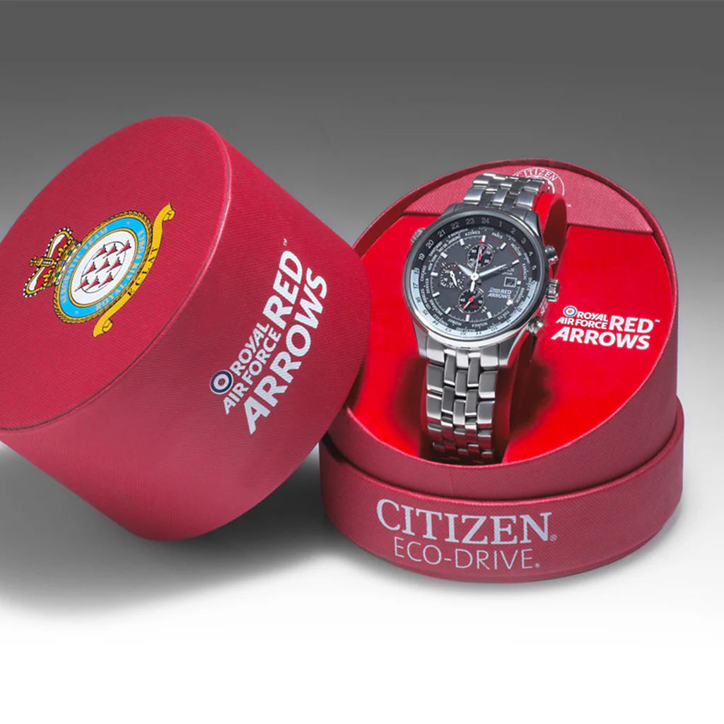 Citizen started life in 1918 as the Shokosha Watch research Institue. Famous for their pocket watches, the Institue produced a commercial model, the Calibre 16 Pocket Watch. Sold under the name of Citizen in 1924, the Calibre 16 started the journey for this Japanese watch brand. The introduction of solar-powered timepieces launched Citizen to international success. By far their most important and successful launch to date, the Eco-Drive threw away conventional ideas regarding standard battery powered watches and helped develop Quartz technology to new levels. The Red arrows collection from Citizen embodies the true essence of Japanese engineering, made with the very best of materials and designed with performance in mind, this mens Citizen Red arrows will stand the test of time. Take to the skies with this chronograph from the Citizen RAF Red Arrows Collection. Styled in stainless steel with a black dial featuring red and white accents. Features include 1/5 second chronograph and 12/24 hour time. The official Red Arrows insignia appears on the watch caseback. Featuring Citizen Eco-Drive technology – powered by light and never needs a battery.