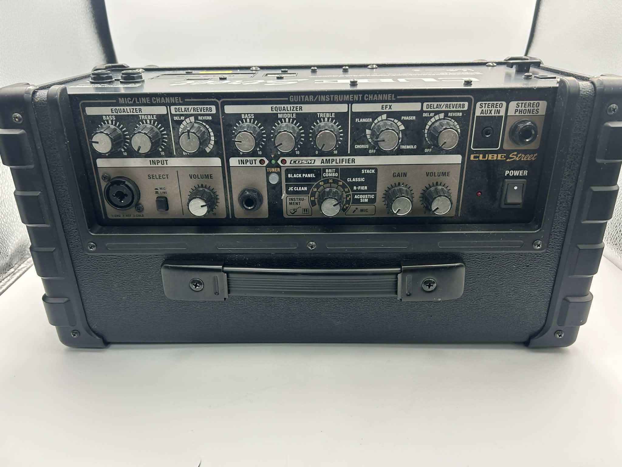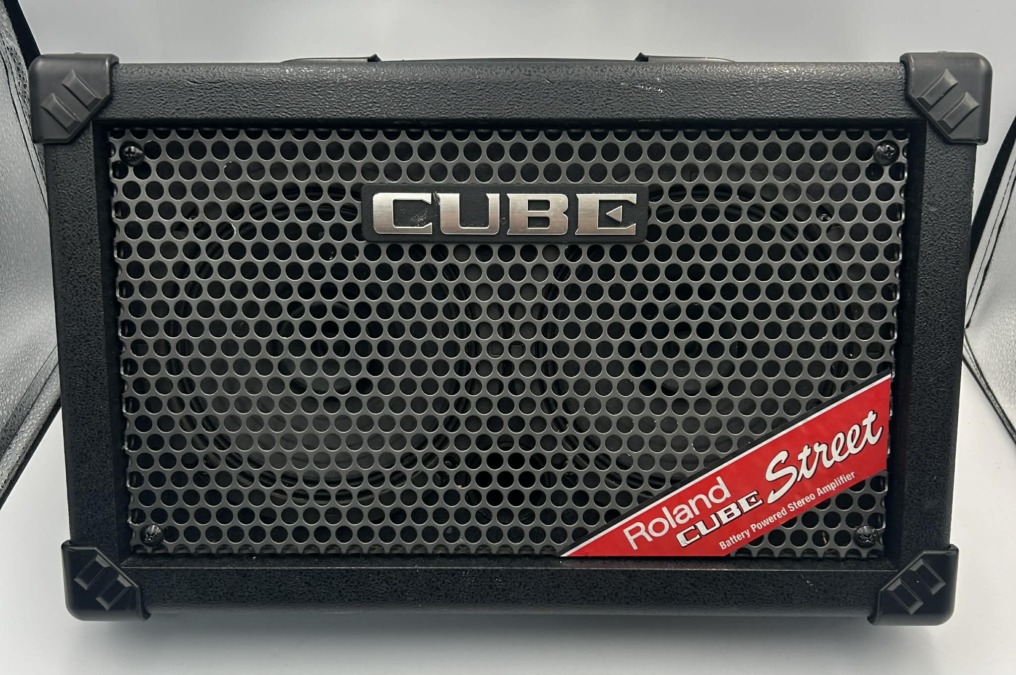 The Roland CUBE Street EX is a 50W (2x25W) portable stereo amplifier featuring dual 8-inch woofers and 2-inch tweeters, powered by 8x AA batteries or an AC adapter. Key features include 4 independent channels, COSM guitar tones, 3-band EQ, onboard effects, and a 7.4kg durable cabinet designed for street performance. Key Technical Specifications Power Output: 50W (Max: 50W/5 hrs, Normal: 25W/10 hrs, Eco: 10W/20 hrs). Speakers: 2x 8" Woofers, 2x 2" Tweeters. Channels: 4 Independent Channels (2x Mic/Instrument, 2x Line/Audio). Inputs: 2x XLR/TRS combo (Mic/Inst), 2x 1/4" Line In, 1x 1/8" Aux In. Outputs: Stereo Line Out, Stereo Link (to chain two units), Headphone jack. Effects: COSM (Clean, Crunch, Lead, Acoustic Sim), Reverb, Chorus/Delay. Dimensions/Weight: 490 x 341 x 305 mm; 7.4 kg (16 lbs 6 oz). Features & Functionality Power Options: 8x AA Alkaline (approx. 5-20 hours) or Ni-MH Rechargeable Batteries, or 13V AC Adapter. i-CUBE LINK: Included cable allows for iPhone/iPad recording and playback. Mounting: Angled back for floor monitoring or compatible with ST-A95 speaker stands. Construction: Durable ABS injection-molded cabinet.