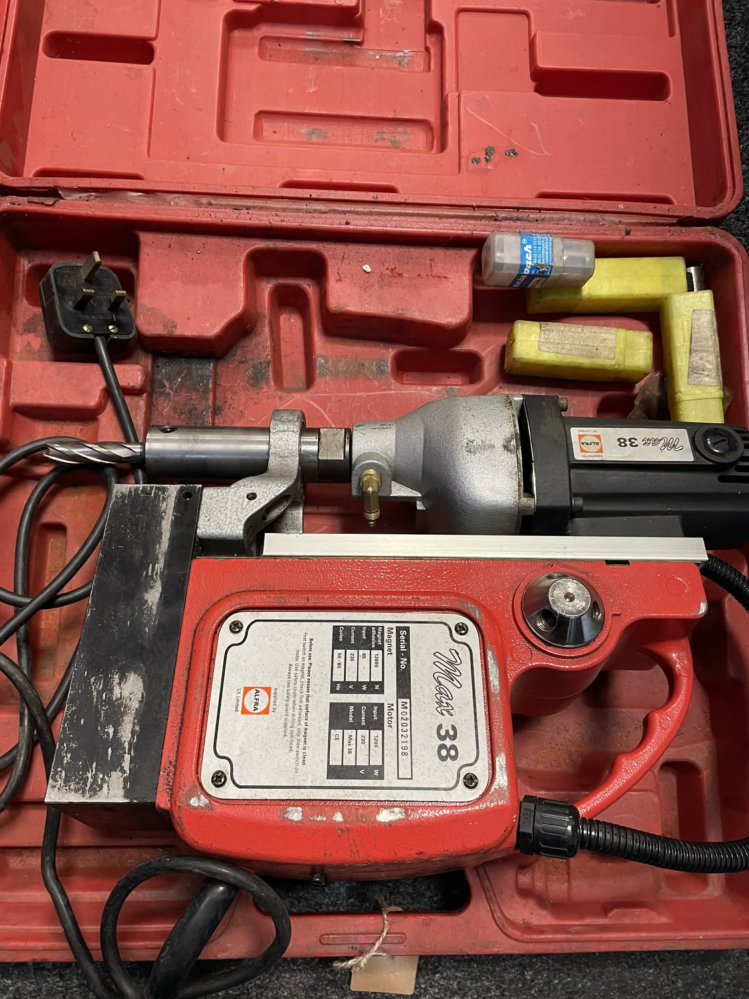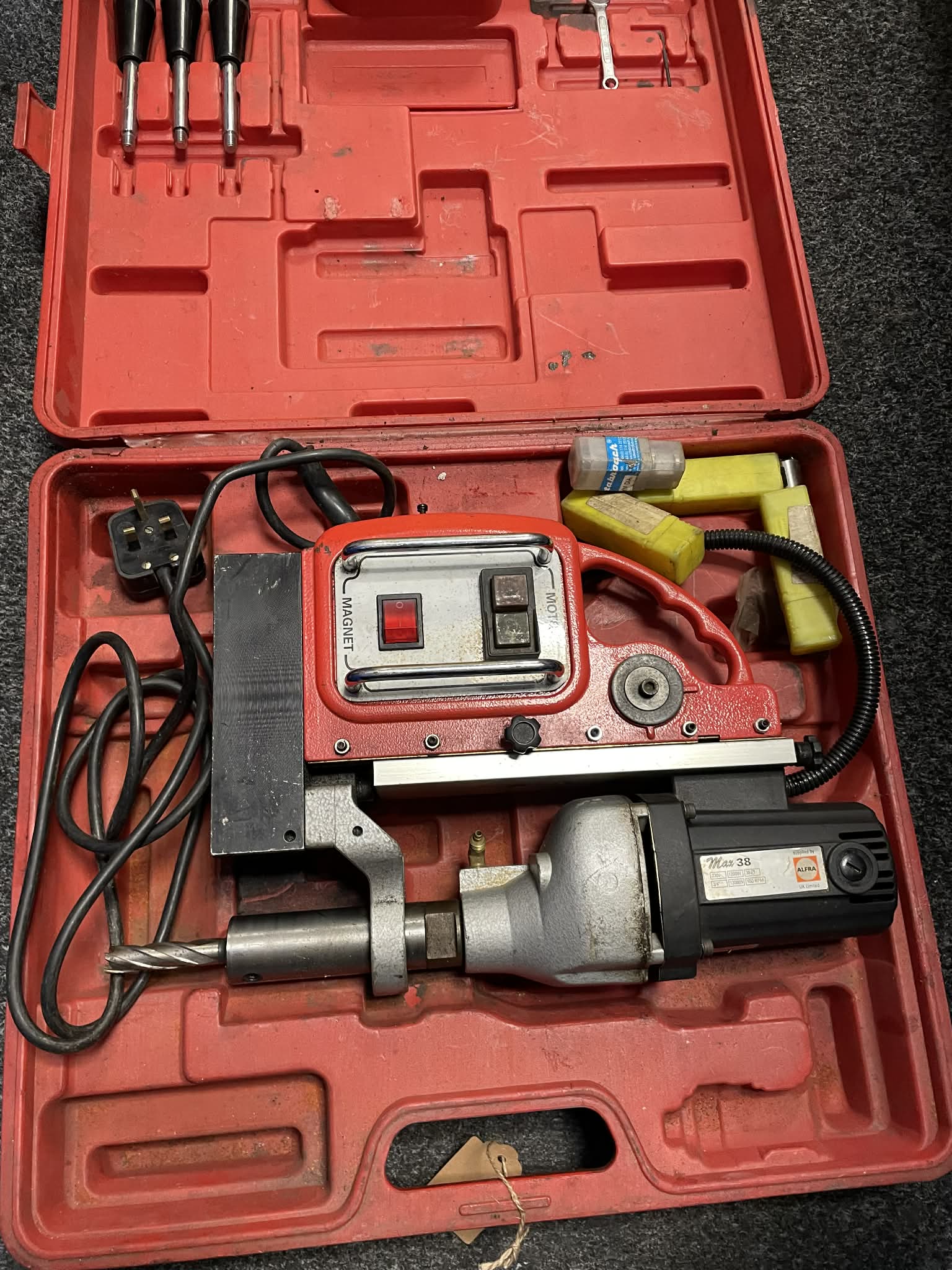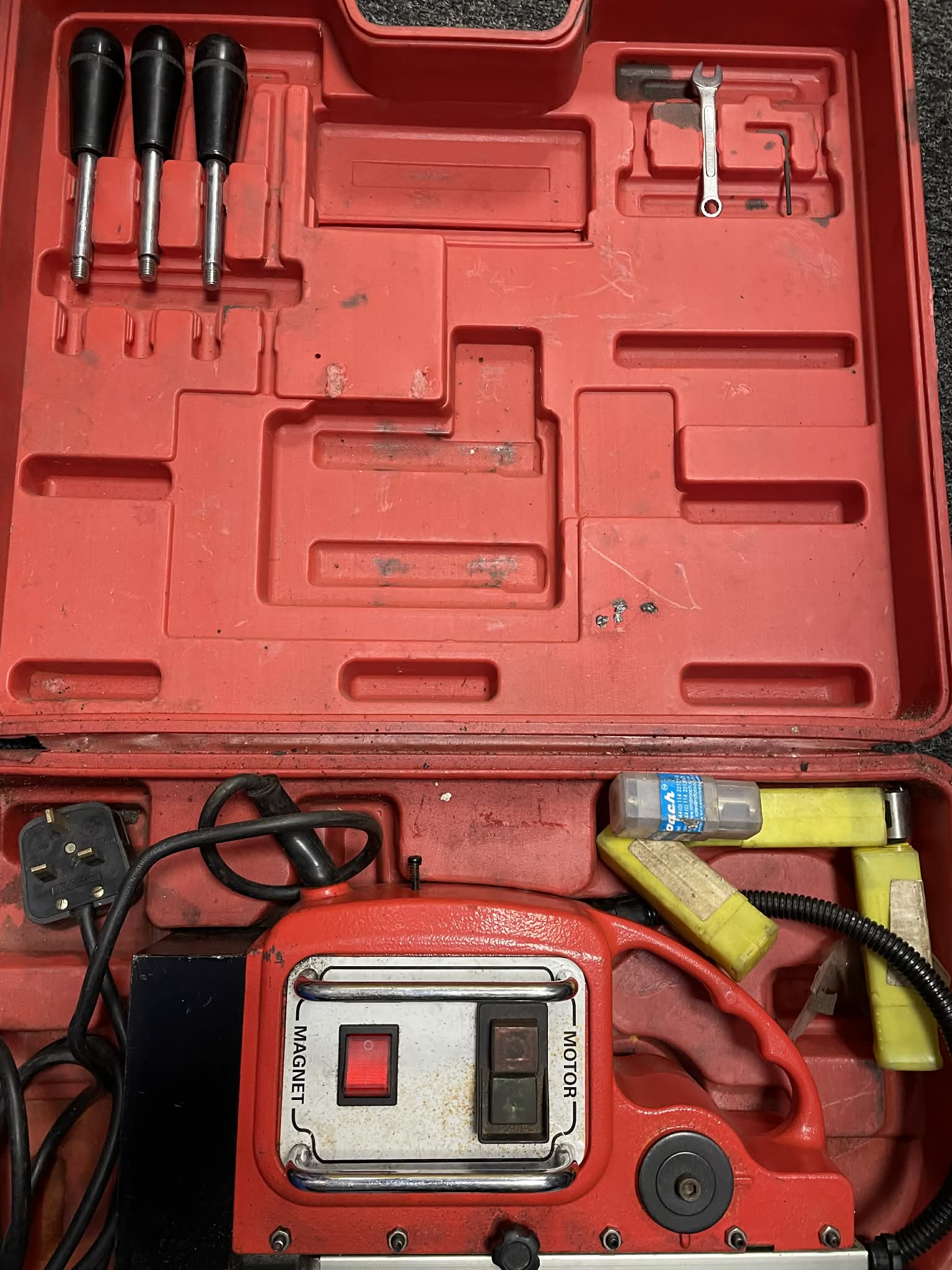 The magnetic-stand makes horizontal, vertical or overhead work possible. - The magnetic-stand makes horizontal, vertical or overhead work possible. ; The machine compact, light construction makes it extremely versatile and easily portable. The core drills in the machine can easily be replaced by twist drills, thus allowing bottoming.; An electronic protective switch prevents inadvertent operation until the magnet has been switched on. The machine is equipped with a safety cutoff if the magnet fails due to outside influences. ; Ideal for use in steel construction, industrial building, engineering, terotechnology, shipbuilding, bridge construction, crane building and assembly work in metalworking shops.