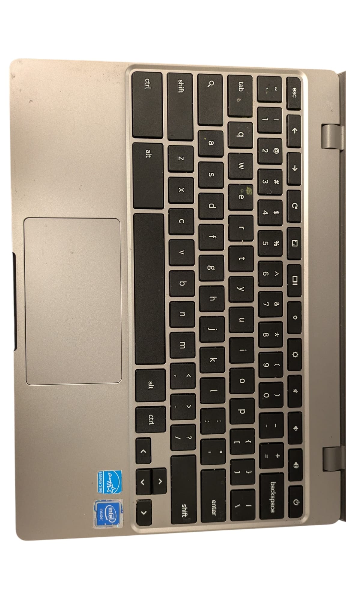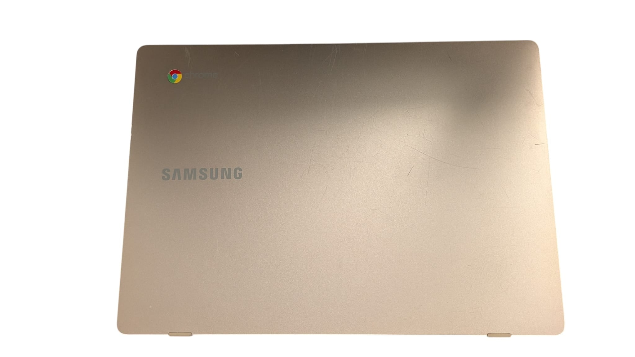 Samsung Chromebook Comes unboxed with charging cable. Has a smaller amount of nail polish on the "E" Key, also has a number of scratches on the top plate.
