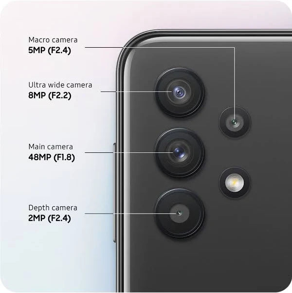 Infinity-V display Watch the latest episode of your favorite show on your daily commute with the Samsung Galaxy A32 5G. With the large 6.5′′ display, scroll through your social media or immerse yourself in a game and let the outer world disappear. Shoot like a pro Capture tiny details as well as panoramatic views – the 4 main cameras with a range of angles will let you unleash your inner artist. With special AI editing features, experimenting with your camera never gets boring. Your Instagram account will be the envy of everyone. 5G connectivity There’s no need to wait for videos to load. Thanks to 5G connectivity, stream, play and share content without annoying lag. Once you’ve experienced the fast speeds of 5G, you may never want to go back to a slower connection. Long-lasting battery Having fun with all of your phone’s great features can put a great strain on the battery life. Luckily, the A32 5G has a long-lasting battery. Plus, adaptive fast charging can give your phone a quick boost, so you don’t have to limit yourself while using your phone on the go.