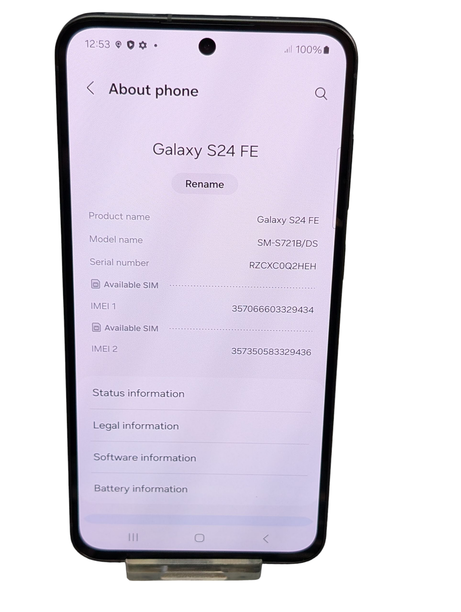SAMSUNG S24 FE, 128gb storage, this is in very good condition, this is unboxed, comes with type c charging cable included. *********************************** Display: 6.7" Dynamic AMOLED 2X, 120Hz, HDR10+, 1080 x 2340 pixels. Chipset: Exynos 2400e (4 nm), 10-core processor. Battery: 4700 mAh. RAM: 8GB. Storage Options: 128GB, Dimensions: 162.0 x 77.3 x 8.0 mm, Weight: 213 g. FOR ANY QUERIES PLEASE CALL OUR PRESTON STORE DIRECT MON-SAT 01772 204889