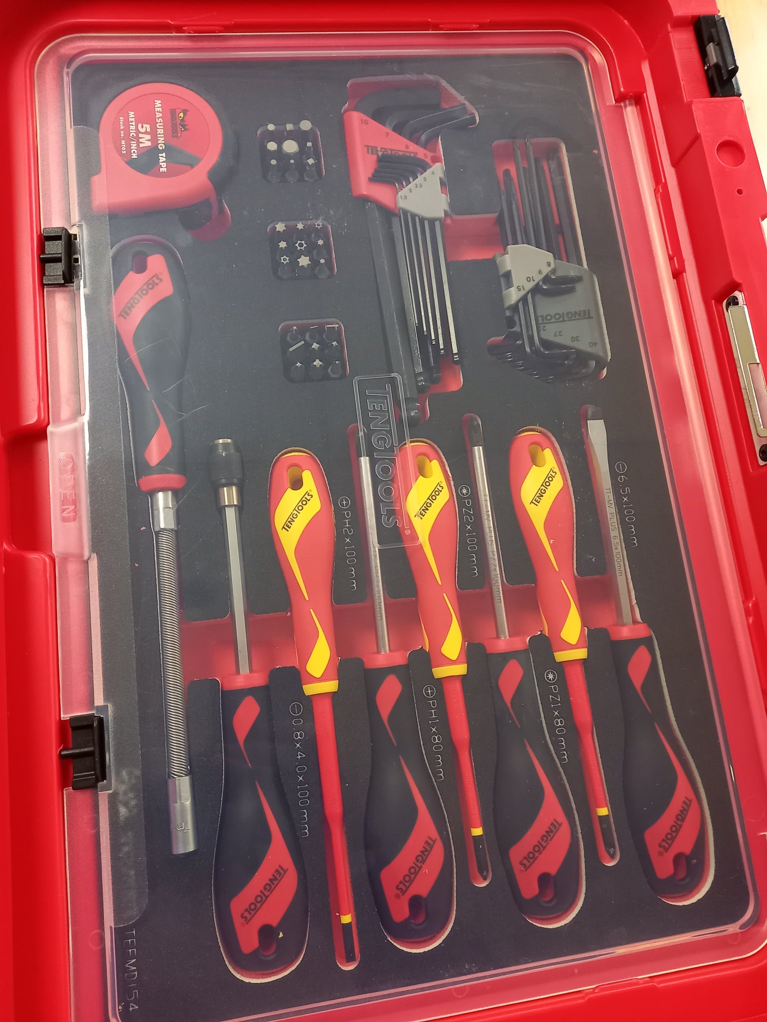 A fully portable tool kit supplied in a hard wearing, unique Teng Tools TC-SC, flight case style carrying case complete with suspension wheels, secure catches, retractable handle and combination lock. The kit includes socket sets, combination spanners, pliers, screwdrivers and a range of general hand tools in one set - ideal for all types of user. The kit also features three EVA trays where all the tools are laid out in three colour pre-cut EVA foam which clearly shows if any tools are not in their place. There are folding clear plastic covers on 2 compartments to hold the tools securely in place when being carried.