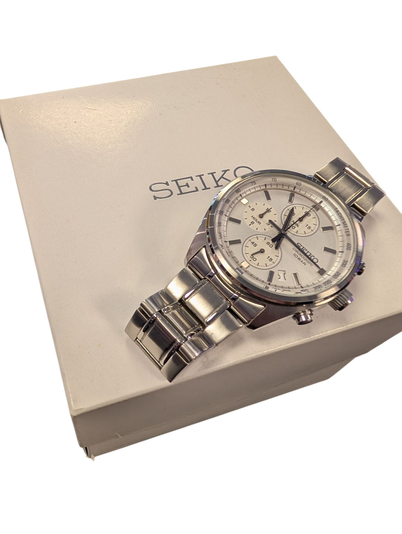 SEIKO CHRONOGRAPH WATCH BOXED WITH BOOKLETS IN GOOD CONDITION. THIS DOES NOT INCLUDE ANY ADDITIONAL LINKS.- MODEL- 197908 ** FOR ANY QUERIES PLEASE CALL OUR CHORLEY STORE DIRECT MON-SAT 01257 752333