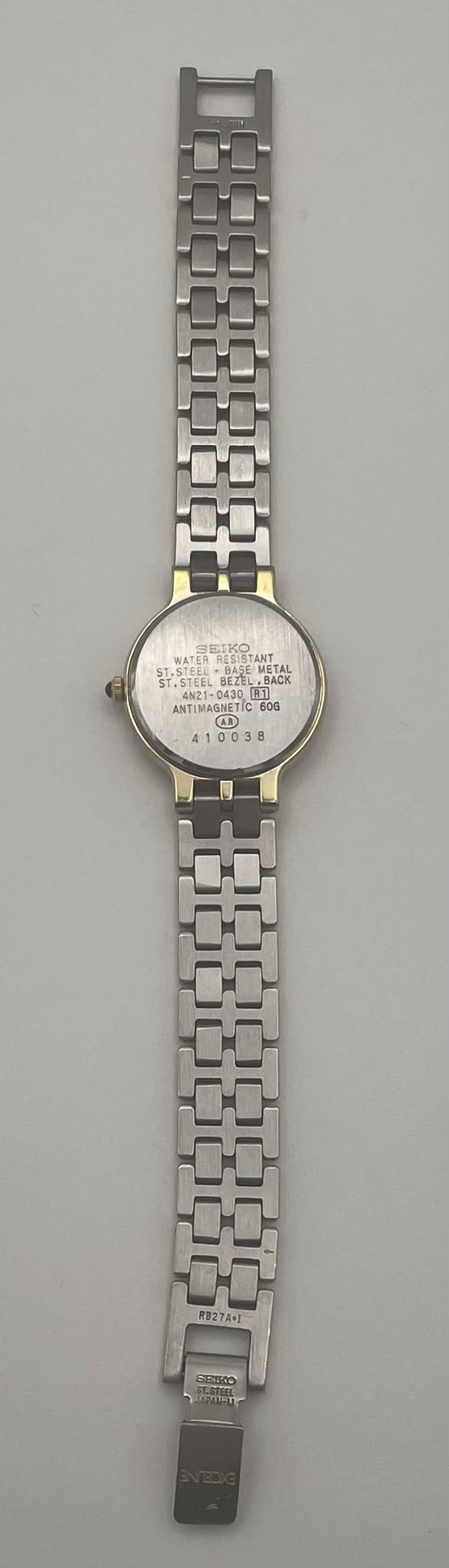 LADIES WATCH COMES UNBOXED WITH NO EXTRA LINKS, THE WATCH MEASURES 16CM IN LENGTH SO IS A SMALL FITTING WATCH. WATER RESISTANT STAINLESS STEEL BACK. ANTIMAGNETIC 60G.