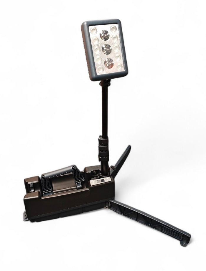 A professional level floodlight, the portable rechargeable LED lighting system, it is typically used by emergency services, highways and rail agencies, and on construction sites. Emitting a powerful 16,000 lumen light output enabling you to see up to 500 metres away, it’s extremely compact and light weight, with a heavy-duty shoulder strap and carry handle for easy transportation and use as a searchlight. Plus, it’s IP65 rated to withstand harsh environments. Featuring a self-contained collapsible compact unit for easy storage, the multi-position telescopic pole extends to 1.85 metres with a 180° swivel and tilting head to provide a bright work light. Quick and easy to set-up, it also has a 4-level adjustment to suit your environment and the power cord is built into the pole to avoid snags and damage. Plus, the portable rechargeable LED lighting system features fold out stabilising legs which are suitable for use in high winds and on uneven terrain, with peg holes to secure in place. The control console allows for the running time to be set as needed so that the Solaris Pro will set the light level to last the required time. The digital display also makes it easy to select light modes, beam options and features a battery status indicator. The portable rechargeable LED lighting system will even automatically adjust its light output so it lasts the entire runtime you require.