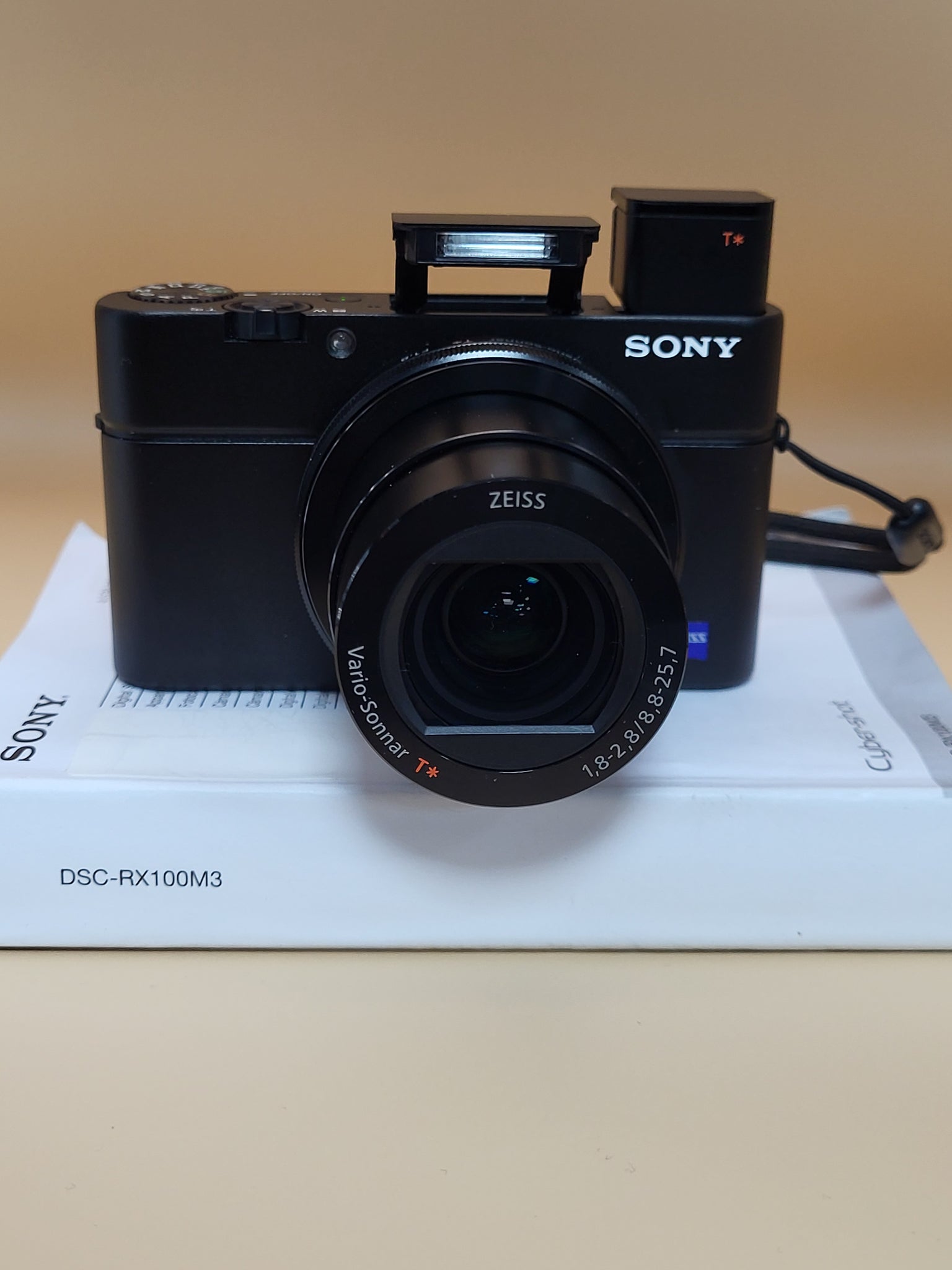 Sony Cyber-Shot RX100 3rd Generation - Unboxed in very good conditiion - no marks or damage - Fast Carl Zeis zom lens -f1.8-f2.8 ( equivelant range 24-70mm ) Pop uo Viewfinder - pop up flash - 20 MP Sensor. Unboxed with strap and charge / data cables Absolutely stunning picture quality, compact enough to take anywhere. Now your photos maintain soft background defocus even when zoomed in with the improved f1.8-2.8 24-70mm Carl Zeiss lens. There's even a pop-up electronic viewfinder for eye-level framing and a 180 tilt screen for 20.1MP selfies. Lastly, the ultra-fast BIONZ X processor adds speed and accuracy for stills as well as beautiful HD video. FeaturesAbsolutely stunning picture quality, compact enough to take anywhere. Now your photos maintain soft background defocus even when zoomed in with the improved f1.8-2.8 24-70mm Carl Zeiss lens. There's even a pop-up electronic viewfinder for eye-level framing and a 180 tilt screen for 20.1MP selfies. Lastly, the ultra-fast BIONZ X processor adds speed and accuracy for stills as well as beautiful HD video.
