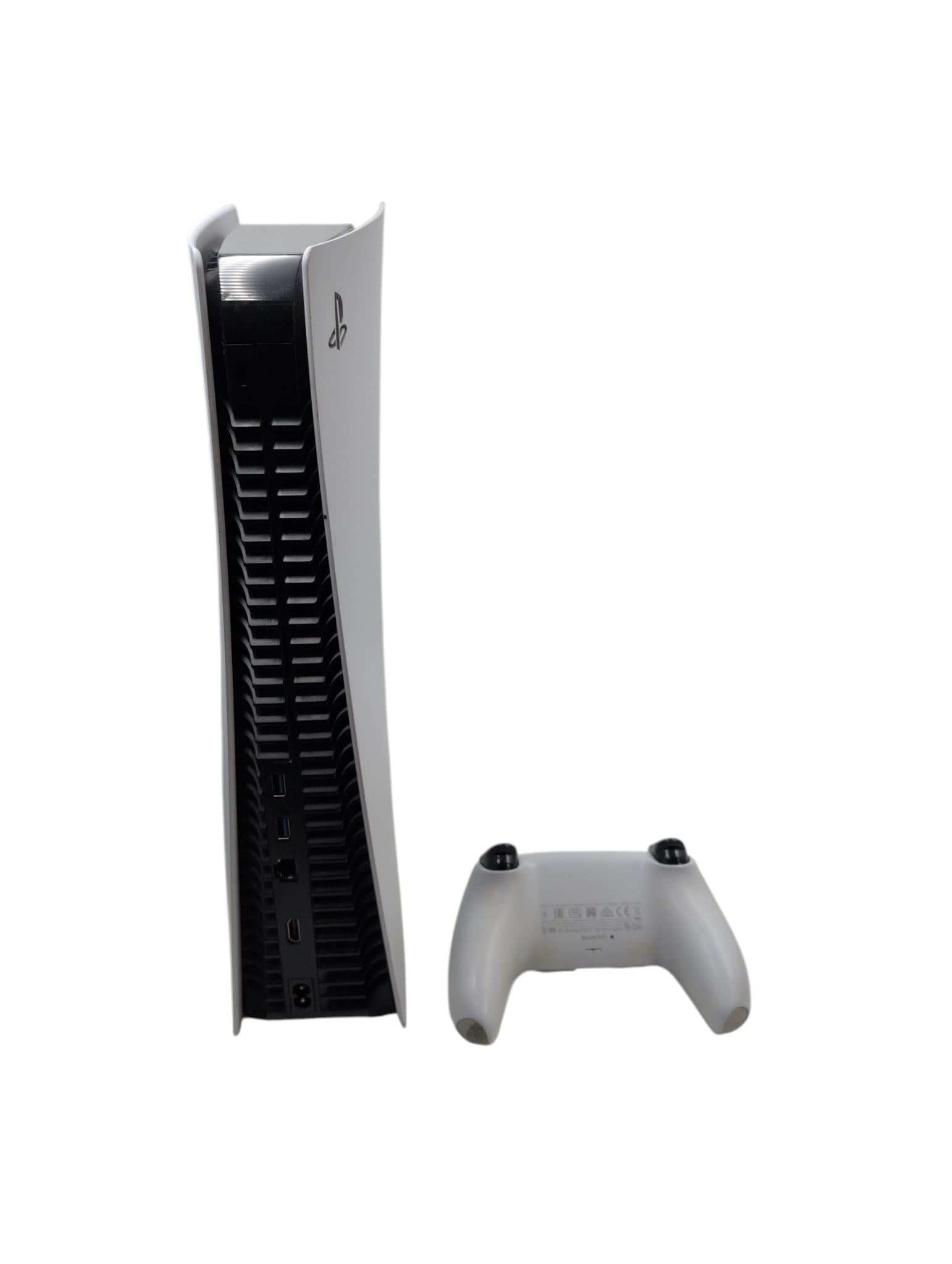 The Sony PlayStation 5 (Original Disc Edition) in White is the launch model of Sony's ninth-generation console, featuring a distinctive, large, white-and-black curved design with an integrated Ultra HD Blu-ray disc drive. It is powered by a custom AMD Zen 2 CPU and RDNA 2 GPU, offering 4K gaming, fast load times via a proprietary SSD, and haptic feedback through the DualSense controller. The original model is known for its robust cooling and iconic design.