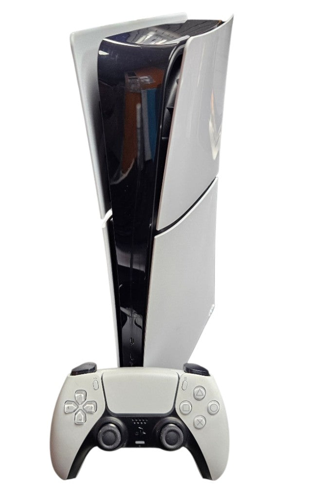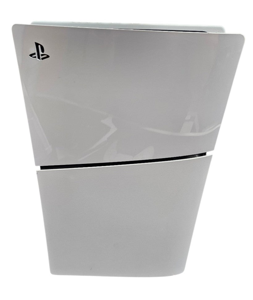 The PS5 Slim Digital is a compact, disc-free version of the PlayStation 5 console with 1TB of storage. It has the same core performance as the original PS5 but in a smaller, lighter design. Key features include two USB-C ports on the front, a removable 1TB SSD, and a horizontal stand. An optional disc drive can be purchased separately if you want to play physical games.