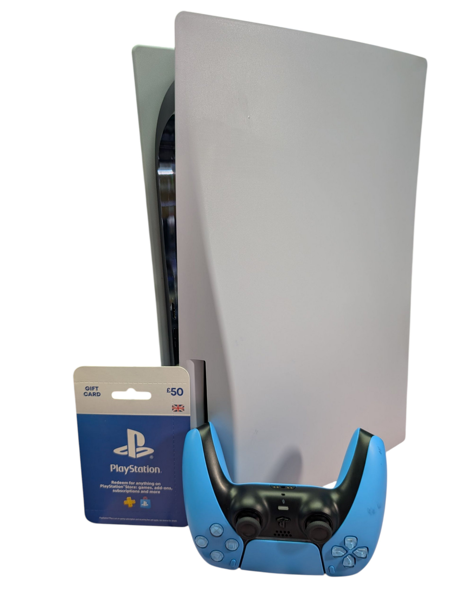 HERE WE HAVE A SONY PS5 DISC EDITION CONSOLE WITH ONE OFFICIAL BLUE CONTROLLER,HDMI & POWER CABLE. THIS COMES UNBOXED AND ALSO INCLUDES A £50 SONY STORE VOUCHER. ** FOR ANY QUERIES PLEASE CALL OUR PRESTON STORE DIRECT MON-SAT 01772 204889