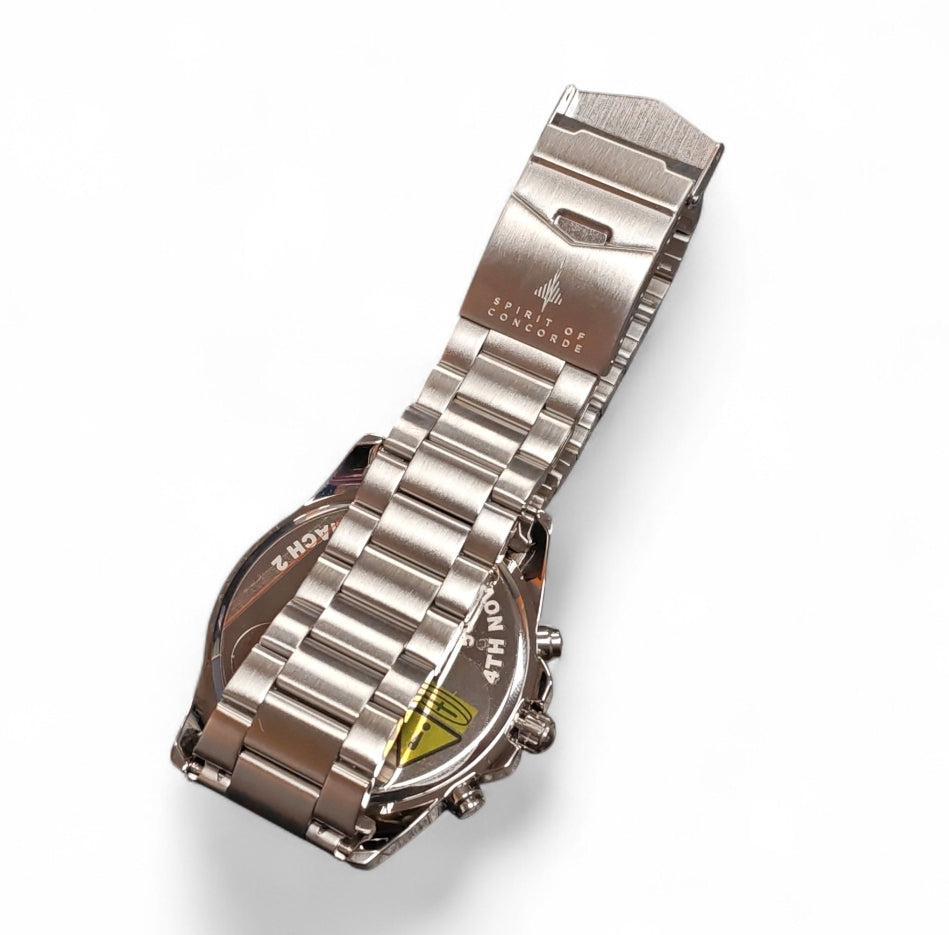 The "Spirit of Concorde Mach 2 50th Anniversary" is a specific chronograph watch produced by The Bradford Exchange to commemorate the 50th anniversary of Concorde reaching Mach 2 speed. The watch is an officially licensed collector's item designed to pay tribute to the iconic supersonic aircraft. The 50th anniversary it commemorates refers to November 4th, 1970, when Concorde 001 first achieved its design cruise speed of over twice the speed of sound. Design: The dial is inspired by the high-tech design of a Concorde cockpit, featuring three chronograph sub-dials with minute and second stop-start functionality and a date display. Materials: It features a rugged stainless steel casing and strap, with some variants also available with rich gold-plating. Movement: The watch uses a precision Quartz movement. Case Back Etching: The reverse of the watch is etched with the "Spirit of Concorde" logo and the text: "50th ANNIVERSARY – MACH 2 – 4th November". Collectability: It is described as a first-of-a-kind, limited-edition timepiece and comes with a Certificate of Authenticity