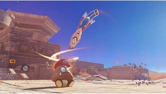 Mario embarks on a new quest to save Princess Peach in the Super Mario Odyssey Nintendo Switch game. Run and jump through huge 3D worlds in the first sandbox-style Mario game since Super Mario 64 and Super Mario Sunshine.Travel beyond the Mushroom Kingdom to mysterious places and exciting new kingdoms. Master new moves with Mario’s ally, Cappy, capturing and controlling objects and enemies. Collect Power Moons on your adventure to power up the airship that sails between worlds.Find something interesting? Toss your cap at it and see what happens! There are lots of fun and surprising ways to interact with your surroundings. For 2-player adventures in Super Mario Odyssey on Nintendo Switch, simply pass your friend a Joy-Con controller to play as Mario and Cappy.