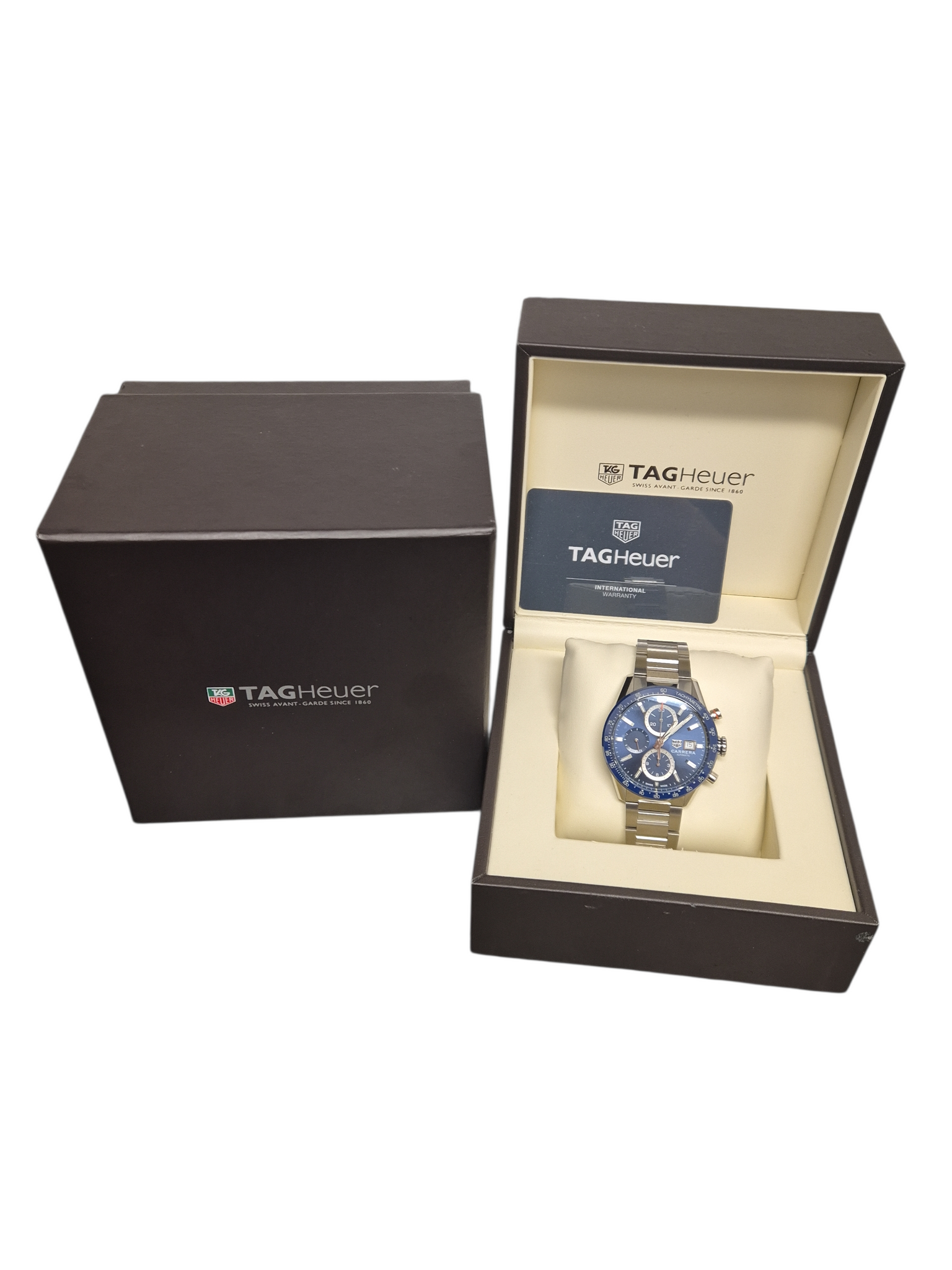This updated model of the TAG Heuer Carrera offers high performance and sports luxe style. It features a sleek black dial with enhanced sporty red touches, as well as numerals and text in a striking new font. Expertly crafted with a distinctive 44mm steel case and a blue ceramic bezel, the TAG Heuer Carrera is powered by the Calibre 16 automatic offering water resistance to 100m. The ergonomic steel H-shape bracelet offers extra comfort and makes a bold, daring statement on the wrist. Model Reference CBN2A1AA. BA0643