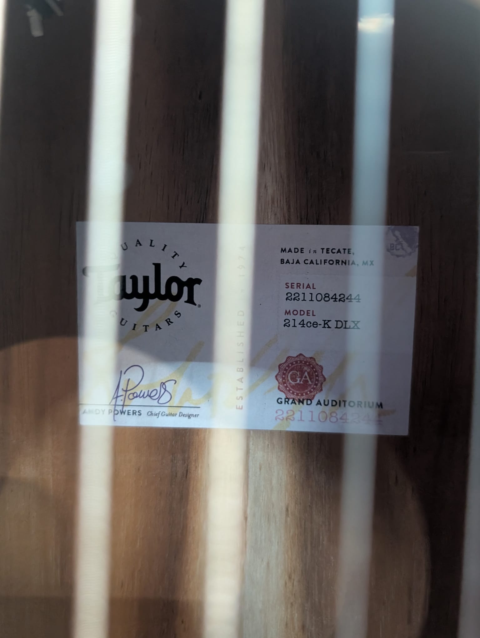Brand: TAYLOR Model: 214CE-K DLX GRAND AUDITORIUM ELECTRO ACOUSTIC Colour: NATURAL WOOD Supplied with: HARD CASE Description: EXCELLENT CONDITION, FEW SIGNS OF USE