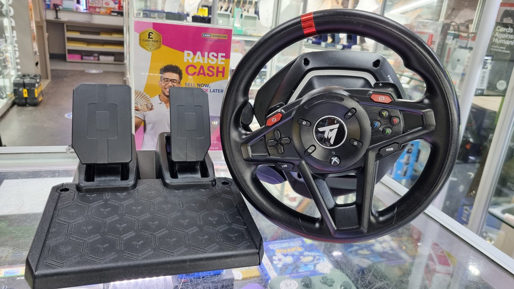 Thrustmaster gaming wheel for Microsoft Xbox One, Microsoft Xbox One S, Microsoft Xbox One X, Microsoft Xbox SERIES S Microsoft Xbox SERIES X. This comes unboxed in good condition.