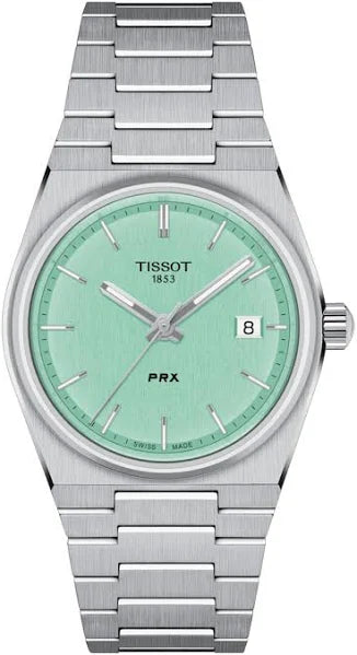 In an exciting new chapter of its story, Tissot introduces new models to its PRX line-up. The range is distinctive for its slenderness, the strength of its design and its timeless style. Now available in a 35mm case, Tissot honours the exact dimensions of the 1978 original on which the PRX's retro design is based. Characterized by its slender satin-finished steel cases, narrow hour markers and steel bracelets. Its wide horizontal links, typical of the era's designs, is fully integrated with the flat, barrel-shaped case. BOXED WITH SPARE LINKS IN VERY GOOD CONDITION