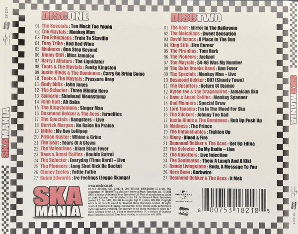 1-01 The Specials– Too Much Too Young Written-By – Jerry Dammers 2:04 1-02 The Maytals– Monkey Man Written-By – Frederick Hibbert* 3:43 1-03 The Ethiopians– Train To Skaville Written-By – Leonard Winston Dillon* 2:50 1-04 Tony Tribe– Red Red Wine Written-By – Neil Diamond 2:55 1-05 Madness– One Step Beyond Written-By – Campbell* 2:19 1-06 Jimmy Cliff– Miss Jamaica Written-By – Jimmy Cliff 2:26 1-07 Harry J Allstars*– The Liquidator Written-By – Harry Zephaniah Johnson* 2:51 1-08 Toots & The Maytals– Funky Kingston Written-By – Frederick Hibbert* 4:54 1-09 Justin Hinds & The Dominoes– Carry Go Bring Come Written-By – Justin Hinds 2:52 1-10 Toots & The Maytals– Pressure Drop Written-By – Frederick Hibbert* 2:57 1-11 Rudy Mills– John Jones Written-By – Rudy Mills 3:09 1-12 The Selecter– Three Minute Hero Written-By – Neol Davies 3:01 1-13 Symarip– Skinhead Moonstomp Written-By – Derrick Morgan, Monty Neysmith, Roy Ellis 2:59 1-14 John Holt– Ali Baba Written-By – Brian Atkinson*, John Holt 2:37 1-15 The Kingstonians– Singer Man Written-By – Jackie Bernard 3:03 1-16 Desmond Dekker & The Aces– Israelites Written-By – Desmond Dekker, Leslie Kong 2:33 1-17 The Specials– Gangsters - Live Written-By – Stephen Panter*, Jerry Dammers, John Bradbury, Lynval Golding, Neville Staple, Rod Byers*, Terry Hall 2:39 1-18 Derrick Morgan– No Raise No Praise Written-By – Derrick Morgan 2:46 1-19 Millie*– My Boy Lollipop Written-By – Jay Roberts*, Morris Levy, Robert Spencer 2:00 1-20 Prince Buster– Whine & Grine Written-By – Cecil Campbell* 3:38 1-21 The Beat (2)– Tears Of A Clown Written-By – Henry Cosby, William Smokey Robinson*, Stevie Wonder 2:40 1-22 The Valentines (3)– Blam Blam Fever Written-By – Earl Grant, V. Grant 2:45 1-23 Dave & Ansel Collins– Double Barrel Written-By – Ansel Collins, Dave Barker (2), Winston Delano Riley* 2:44 1-24 The Selecter– Everyday (Time Hard) - Live Written-By – George Agard, Sydney Crooks* 2:58 1-25 The Pioneers– Long Shot Kick De Bucket Written-By – George Agard, Loren Jackie Robinson*, Sydney Crooks* 2:47 1-26 Clancy Eccles– Fattie Fattie Written-By – Clancy Eccles 2:41 1-27 Rupie Edwards– Ire Feelings (Leggo Skanga) Written-By – Rupie Edwards 3:47 2-01 The Beat (2)– Mirror In The Bathroom Written-By – Cox*, Wakeling*, Steele*, Morton*, Charlery* 3:09 2-02 The Melodians– Sweet Sensation Written-By – Renford Cogle 3:53 2-03 David Isaacs– A Place In The Sun Written-By – Bryan Wells, Ronald Miller 2:45 2-04 King Stitt– Fire Corner Written-By – Clancy Eccles 2:47 2-05 The Piranhas– Tom Hark Written-By – Grover*, Bopeape* 2:42 2-06 The Pioneers– Jackpot Written-By – George Agard, Jackie Robinson (2), Sydney Crooks* 3:05 2-07 The Maytals– 54-46 Was My Number Written-By – Frederick Hibbert* 3:10 2-08 The Baba Brooks Band– Gun Fever Written-By – The Baba Brooks Band 2:51 2-09 The Specials– Monkey Man - Live Written-By – Frederick Hibbert* 2:53 2-10 Desmond Dekker– 007 (Shanty Town) Written-By – Desmond Dekker 2:39 2-11 The Upsetters– Return Of Django Written-By – Lee Perry 2:30 2-12 Byron Lee & The Dragonaires*– Jamaican Ska Written-By – Byron Lee, Keith Lynn*, Lazarus* 2:27 2-13 Dave & Ansel Collins– Monkey Spanner Written-By – Ansel Collins, Dave Barker (2), Winston Delano Riley* 2:29 2-14 Bad Manners– Special Brew Written-By – Sayag*, Marson*, Kane*, Farris*, Trendle*, Cooke*, Stewart*, Hyman* 3:35 2-15 Lord Tanamo– I'm In The Mood For Ska Written-By – Jimmy McHugh & Dorothy Fields 2:29 2-16 The Slickers– Jonny Too Bad Written-By – Delroy Wilson, Derrick Leapold Crooks*, Hylton Beckford, Winston Bailey 3:09 2-17 Justin Hinds & The Dominoes– Rub Up Push Up Written-By – Justin Hinds 2:45 2-18 Madness– The Prince Written-By – Thompson* 2:28 2-19 The Untouchables*– Tighten Up Written-By – Derrick Harriott, Lee "Scratch" Perry* 2:37 2-20 Niney*– Blood & Fire Written-By – Winston "Niney The Observer" Holness* 3:06 2-21 Desmond Dekker & The Aces– Get Up Edina Written-By – Desmond Dekker 2:39 2-22 The Selecter– On My Radio - Live Written-By – Neol Davies 3:41 2-23 The Upsetters– Live Injection Written-By – Lee Perry 3:30 2-24 The Soulmates– Them A Laugh And A Kiki Written-By – George Agard, Sydney Crooks* 2:38 2-25 Dandy Livingstone– Rudy, A Message To You Written-By – Robert Livingstone Thompson 2:42 2-26 Nora Dean– Barbwire Written-By – Nora Dean 2:32 2-27 Desmond Dekker & The Aces– It Mek Written-By – Desmond Dekker, Leslie Kong 2:21