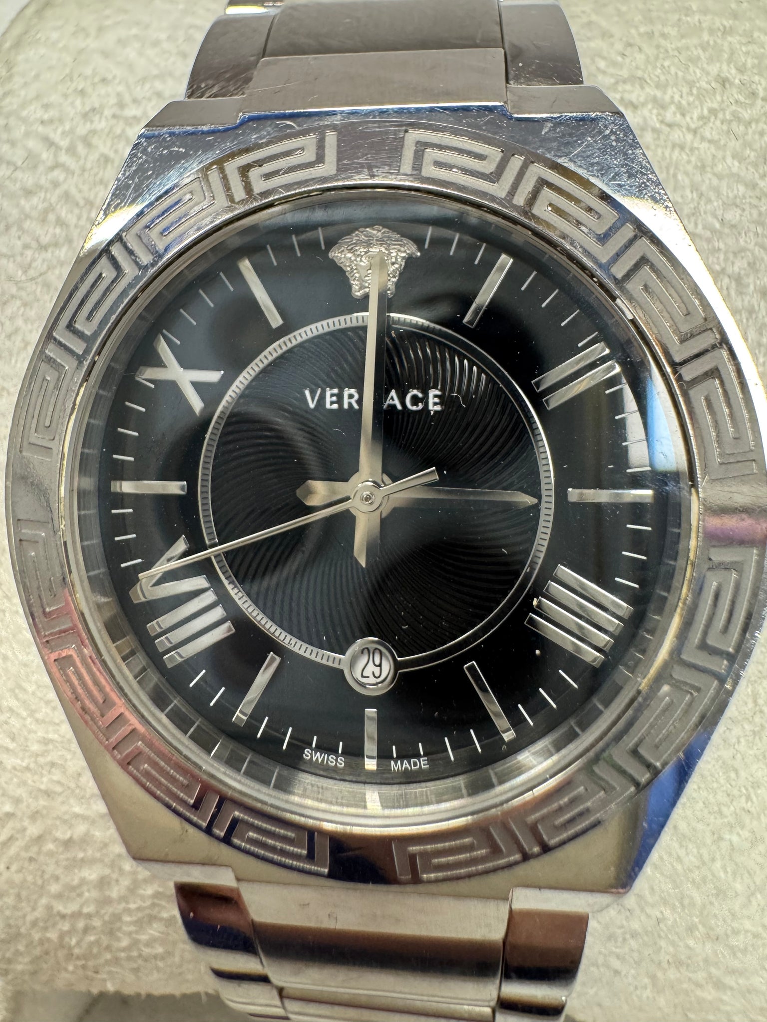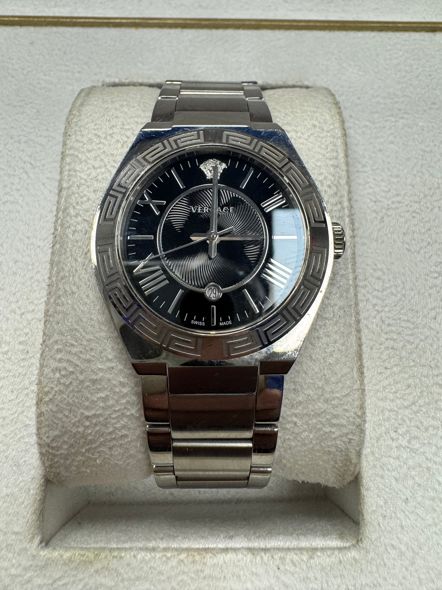 For sale is an authentic Versace Landmark Swiss-made timepiece. This is a classic luxury watch featuring the iconic Medusa head at 12 o’clock and the signature "Greca" (Greek Key) engraving on the bezel. Watch Details: Model: Versace Landmark Movement: Swiss Quartz (Battery-powered) Dial: Sunray Black with Roman numeral markers at 4, 8, and 10. Crystal: Scratch-resistant Sapphire Crystal. Material: 316L Surgical-grade Stainless Steel. Size: ~38mm Case (Elegant Unisex/Ladies profile). Functions: Circular date window at 6 o'clock.