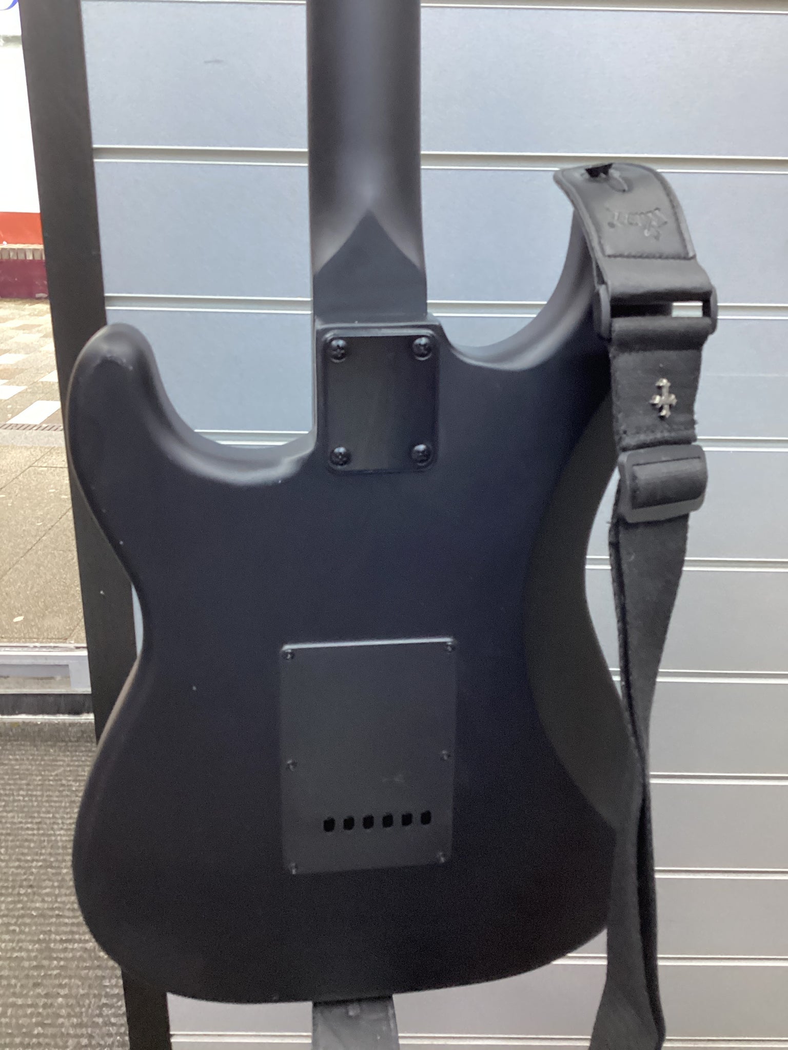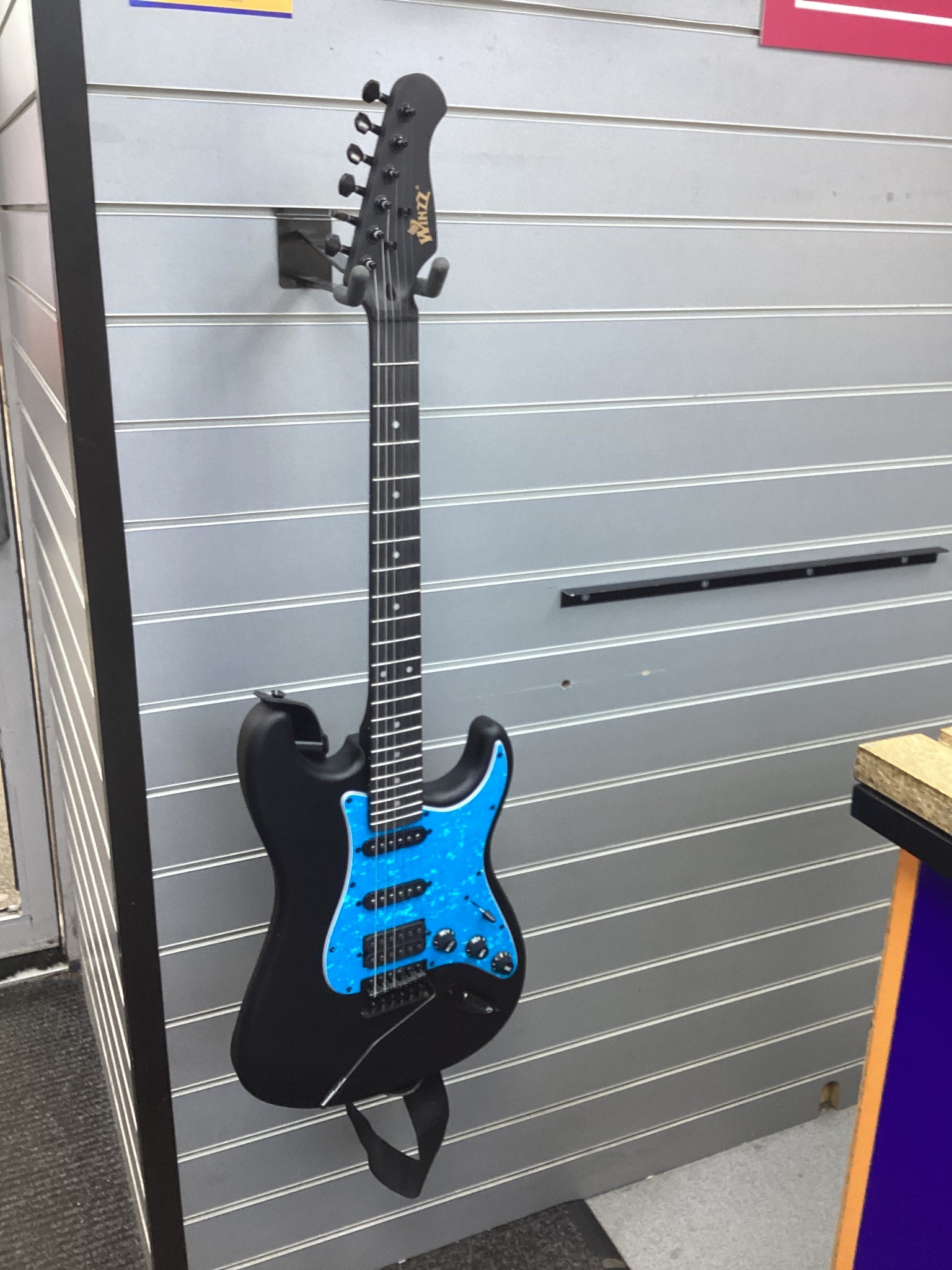 Winzz Matt black bodied guitar, faux blue mother of pearl inlay. Whammy bar and shoulder strap