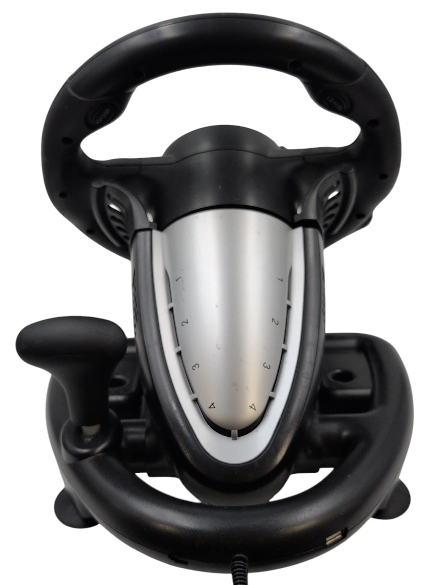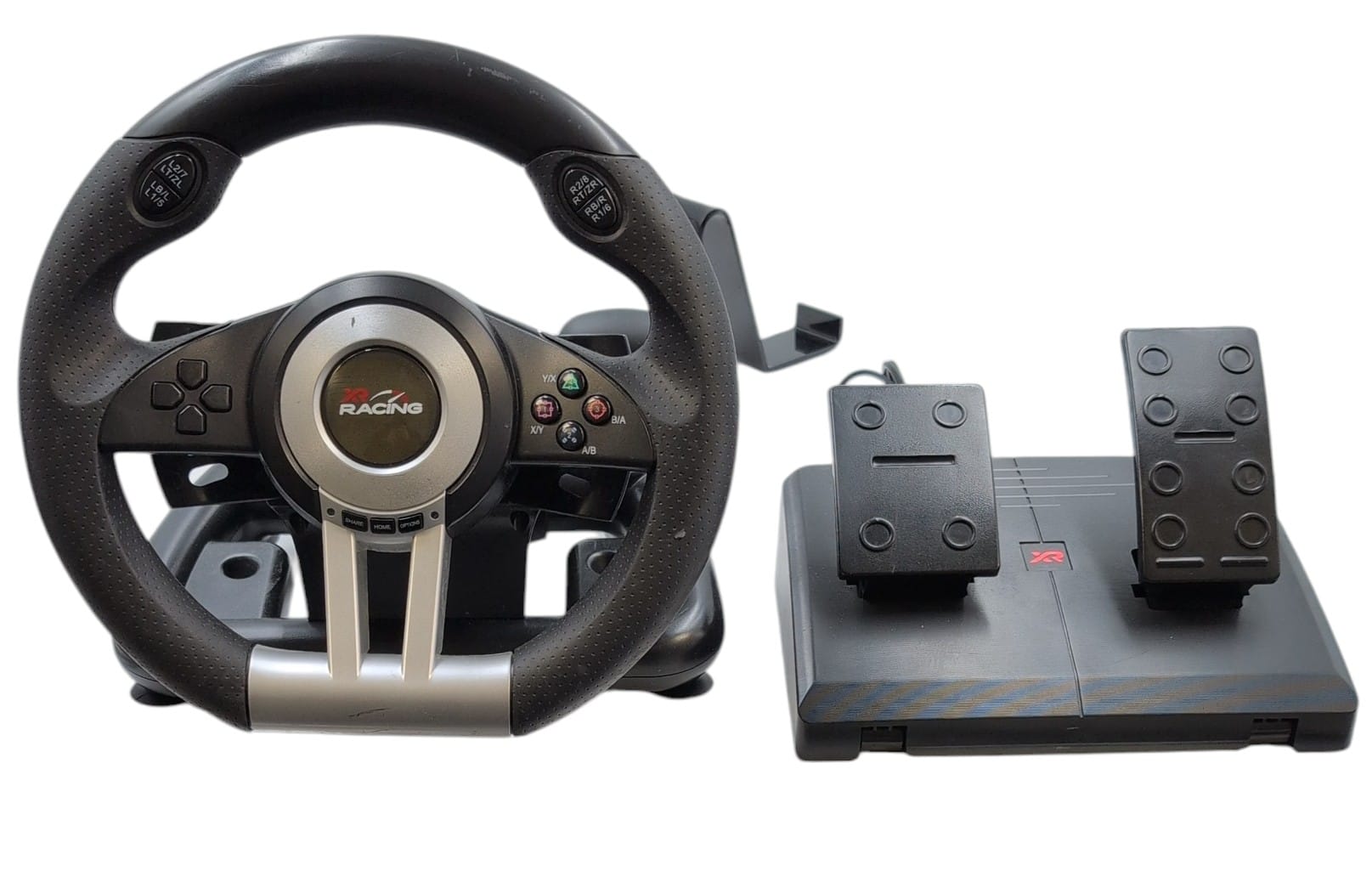 The X Rocker XR Racing Wheel is a wired, multi-format steering wheel and pedal set designed for PlayStation 4, PS3, Xbox, and Nintendo Switch. It features 180-degree rotation, rubberized grips, vibration motors, and paddle shifters. It requires a wired connection to a genuine DualShock 4 controller to function.