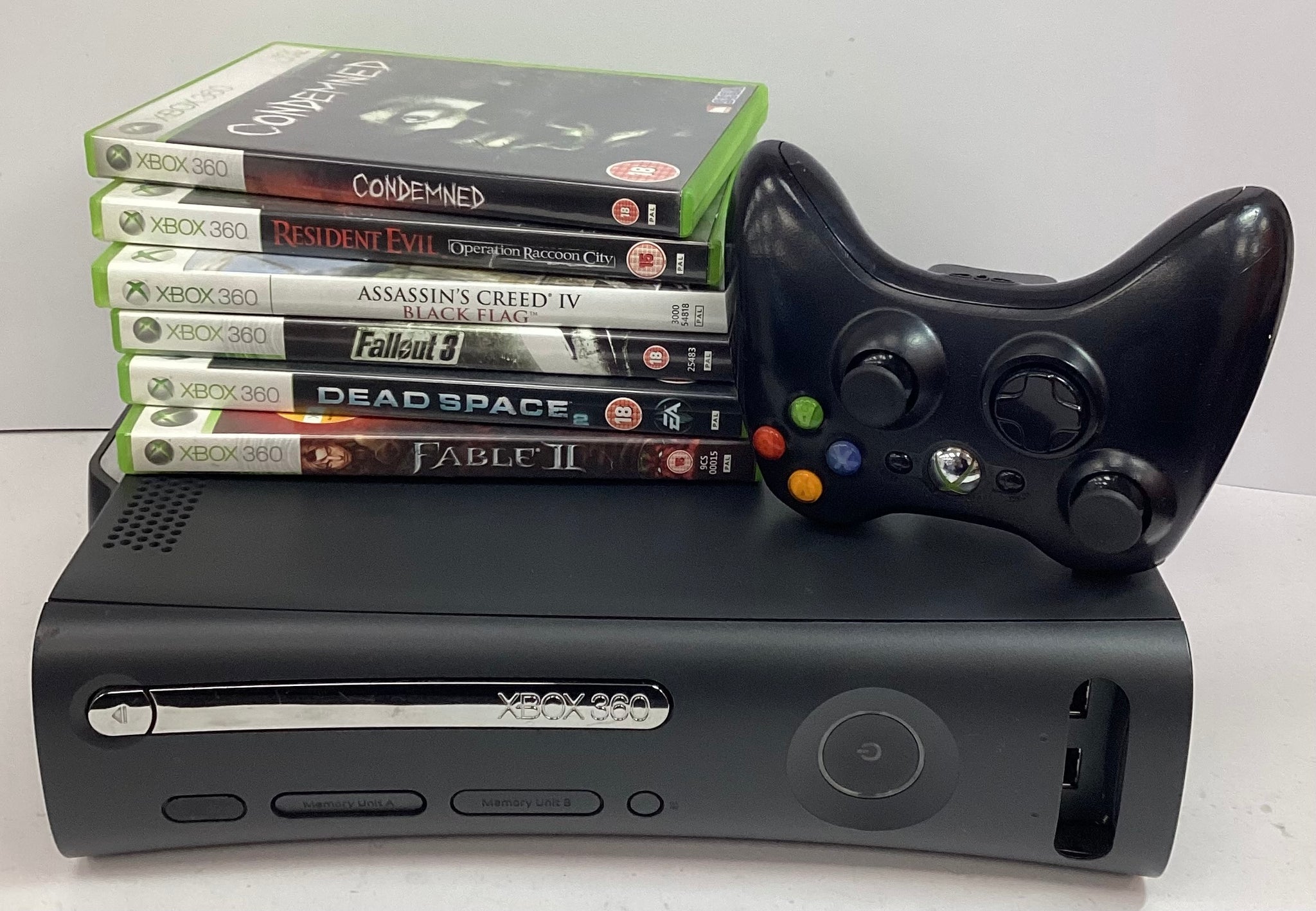 Black Xbox 360 bundle with 120gb storage, comes with 1 controller and 6 games
