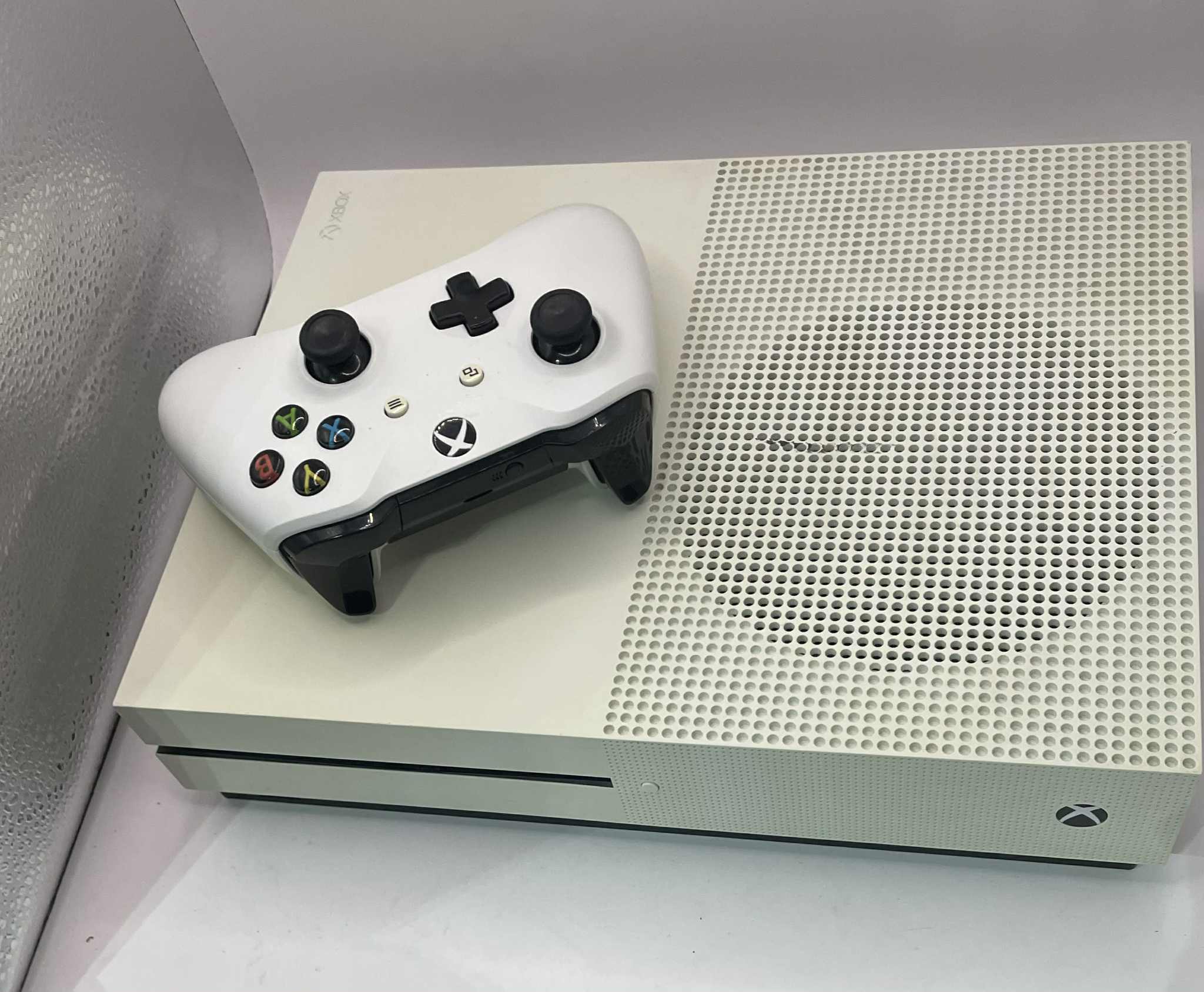 Xbox one S - 500gb cones with one white controller Comes with power lead Some discoloration one the console small black mark on the console Two missing feet As shown in photos