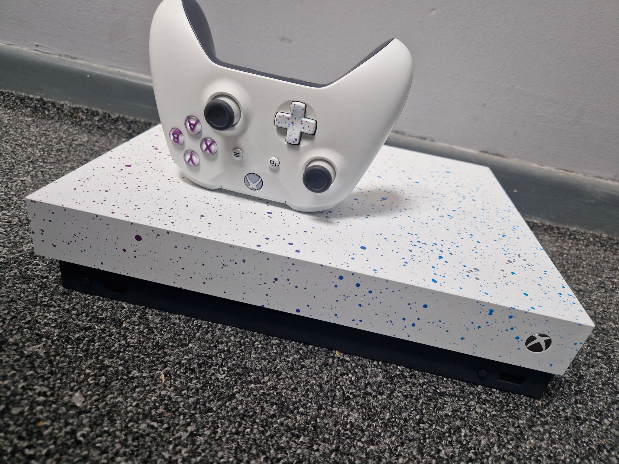 Xbox one x Hyperspace edition. Unboxed but in great condition, the controller doesn't have a back on to cover the batteries please see pictures. Purple and blue speckles