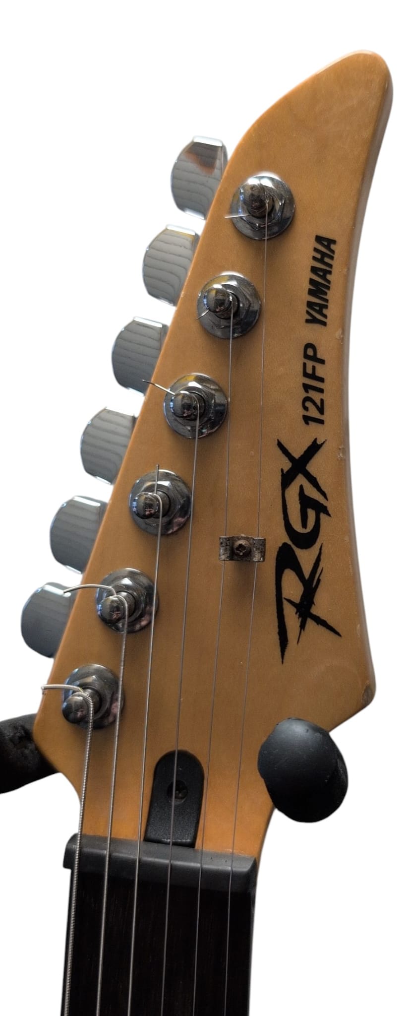 The Yamaha RGX 121FP is a, early 1990s (approx. 1991–1994) Taiwan-made "Free Art" electric guitar featuring a unique transparent. It is a versatile, solid-body super-strat with an HSH or HSS pickup configuration, designed for modern rock, featuring a comfortable, fast, thinner neck and a, vintage-style tremolo.